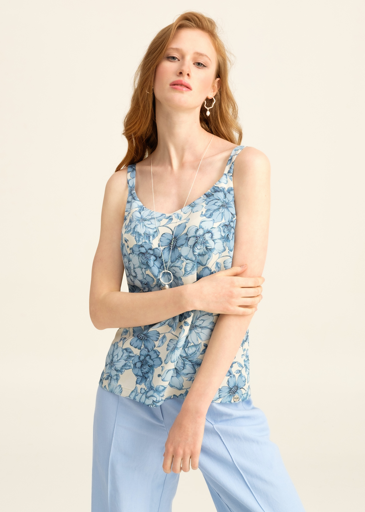 Легкий топ на бретелях с вырезом мягким уголком и цветочным принтом. Снизу слева пришит медальон с фирменным знаком - стрекоза.