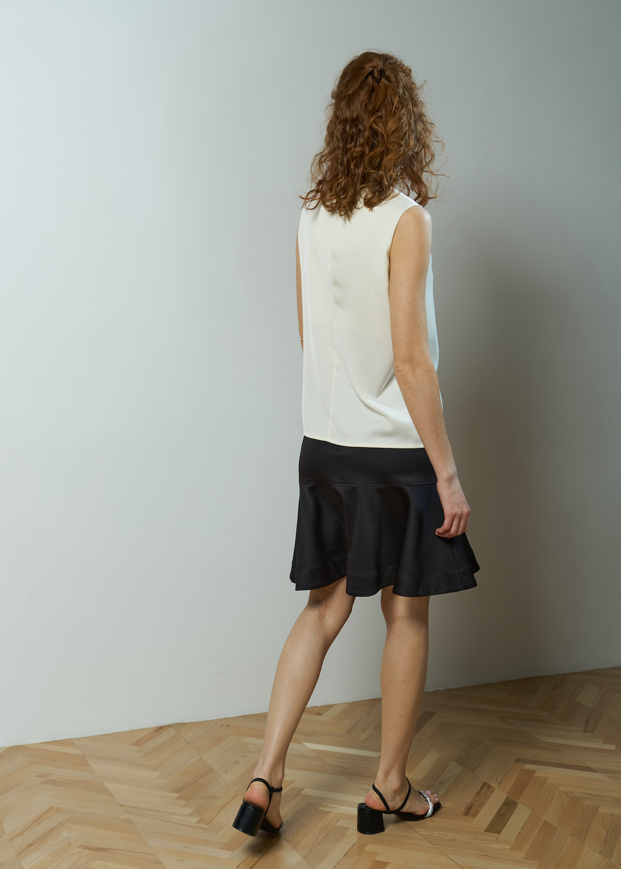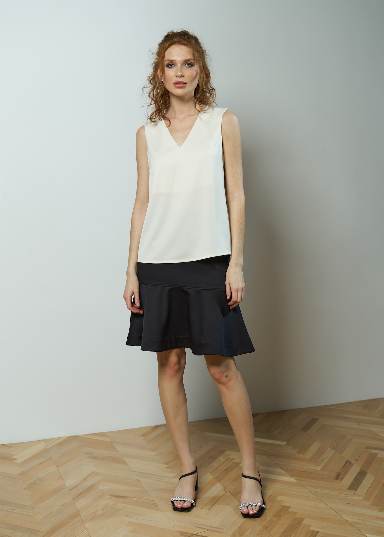 Топ молочный атласный без рукавов с широким плечом и V- образным вырезом. Однотонная, струящийся модель прямого силуэта без застежки.