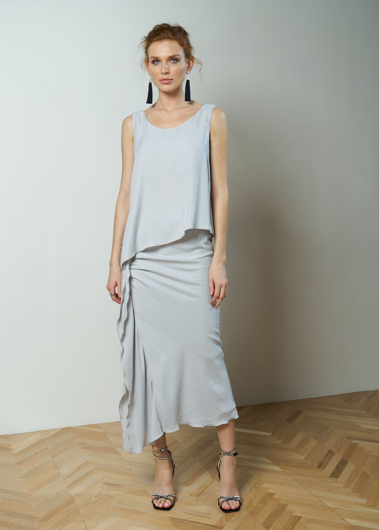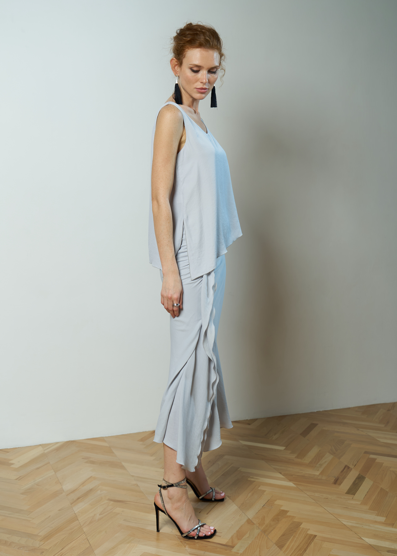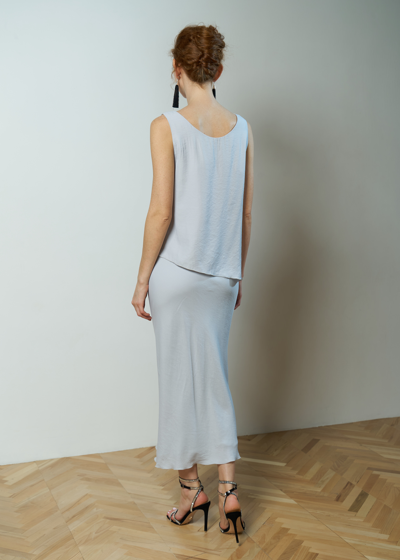 Ассиметричный топ голубой, без рукавов с широким плечом. Струящееся модель прямого кроя с ассиметричным низом и разрезом, с одной стороны. Топ с круглым вырезом без застежки.