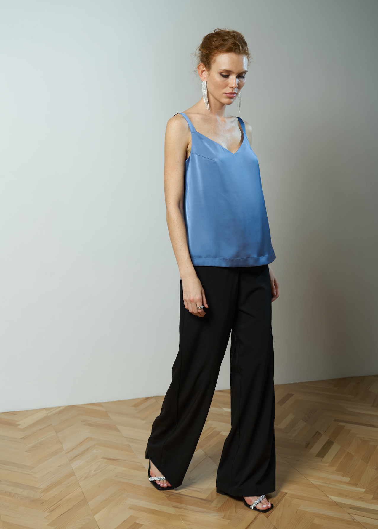 Голубой атласный топ на бретелях без рукавов. Модель с V-образным вырезом и вытачками на груди. Струящийся однотонный топ прямого кроя, без застежек.