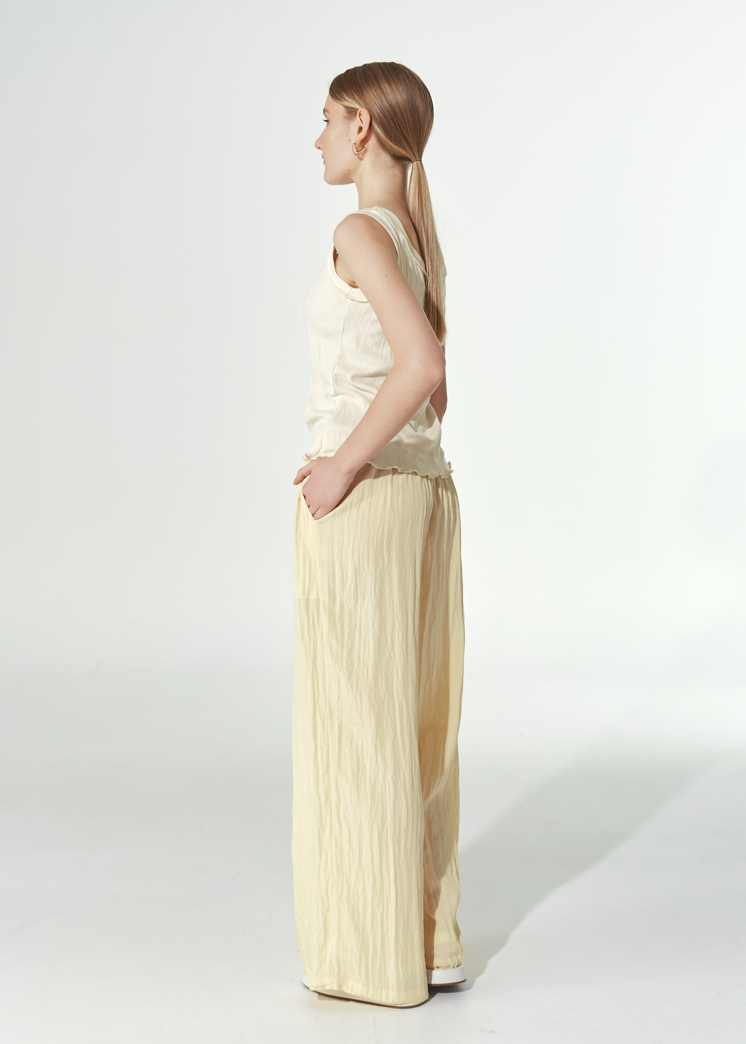 Топ трикотажный женский приталенный. Модель «майка» без рукавов с глубоким круглым вырезом без застежки.