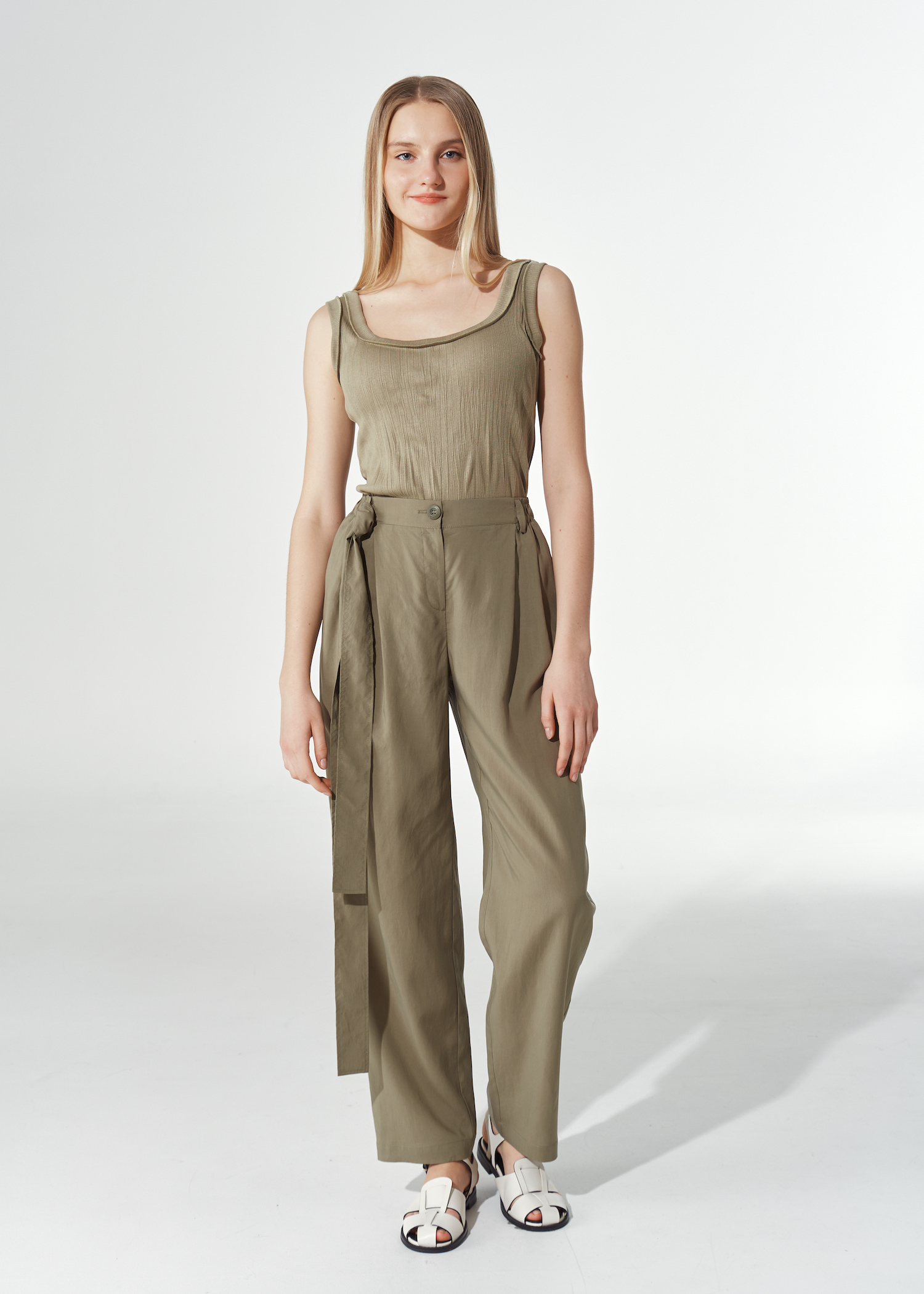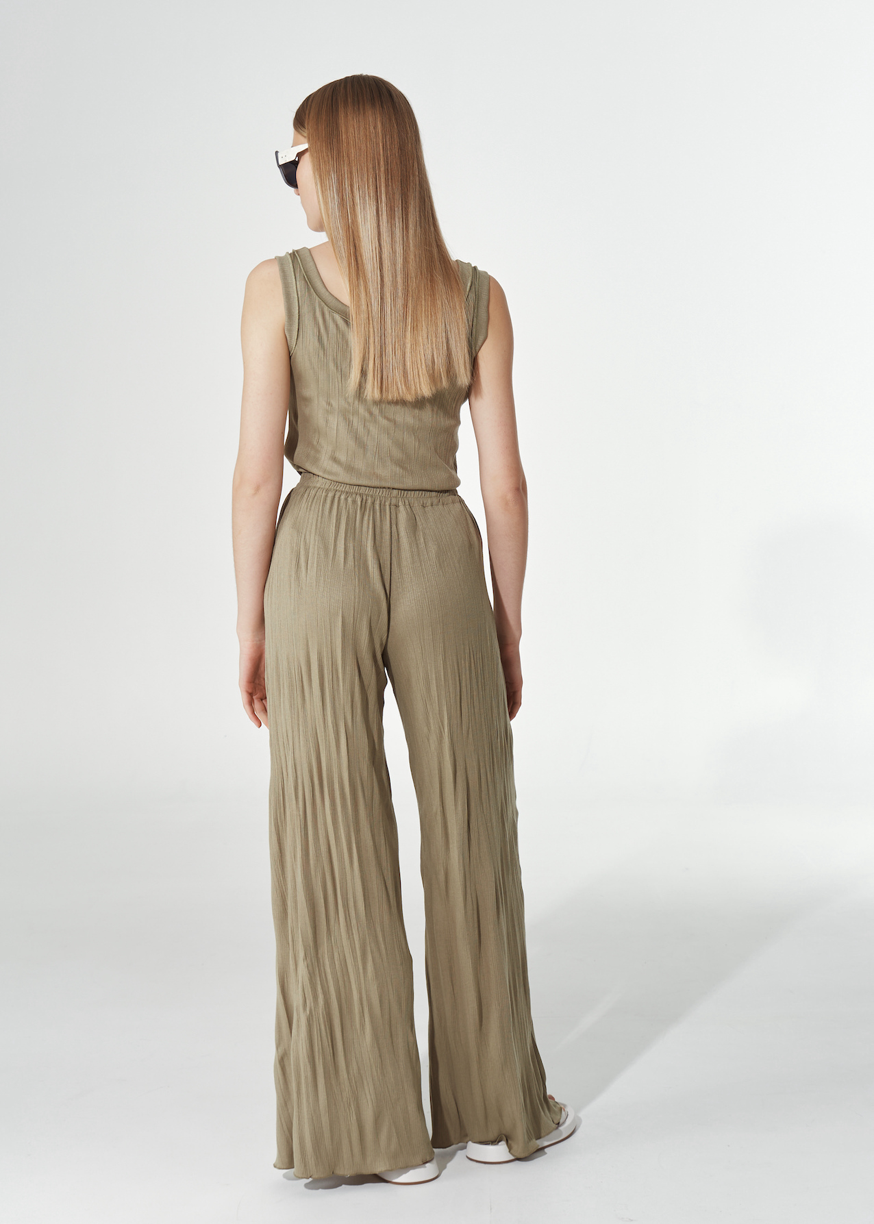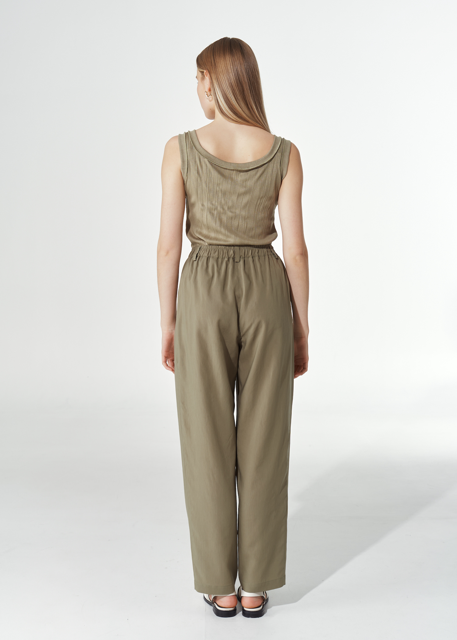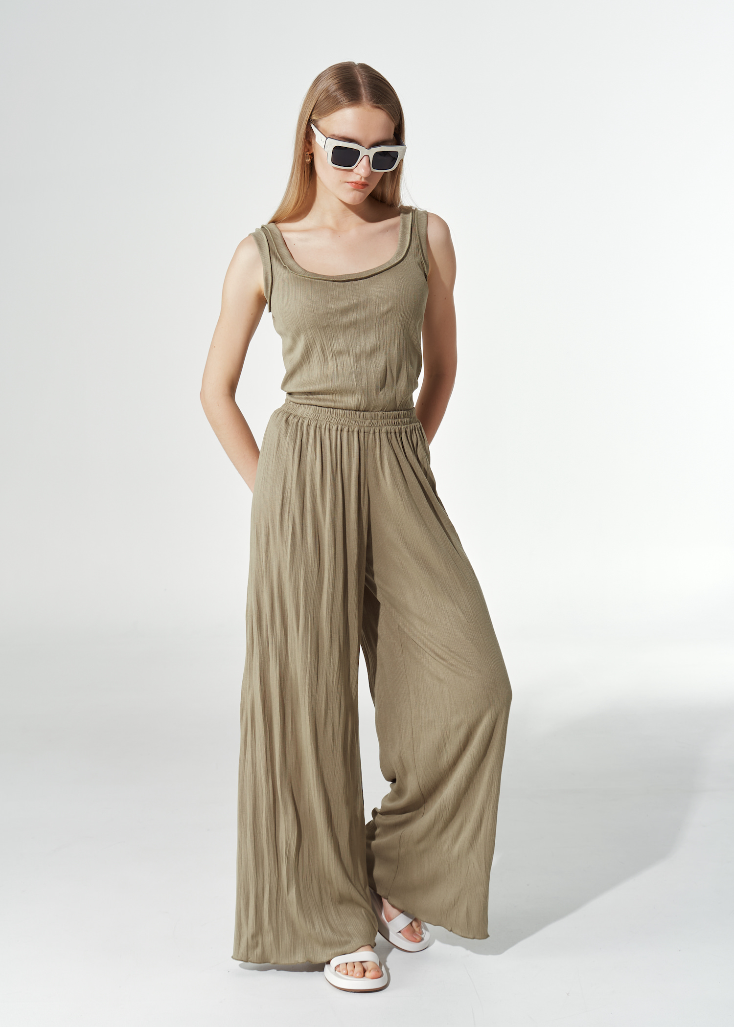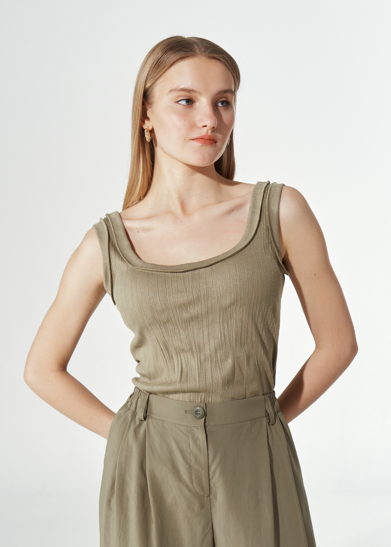 Трикотажный топ приталенного кроя. Модель без рукавов с глубоким круглым вырезом и окантовкой в тон. Без застежки.