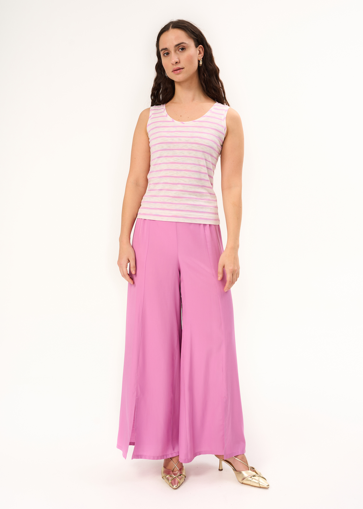 Майка в розовую полоску. Приталенная модель с круглым вырезом без рукавов и застежек.