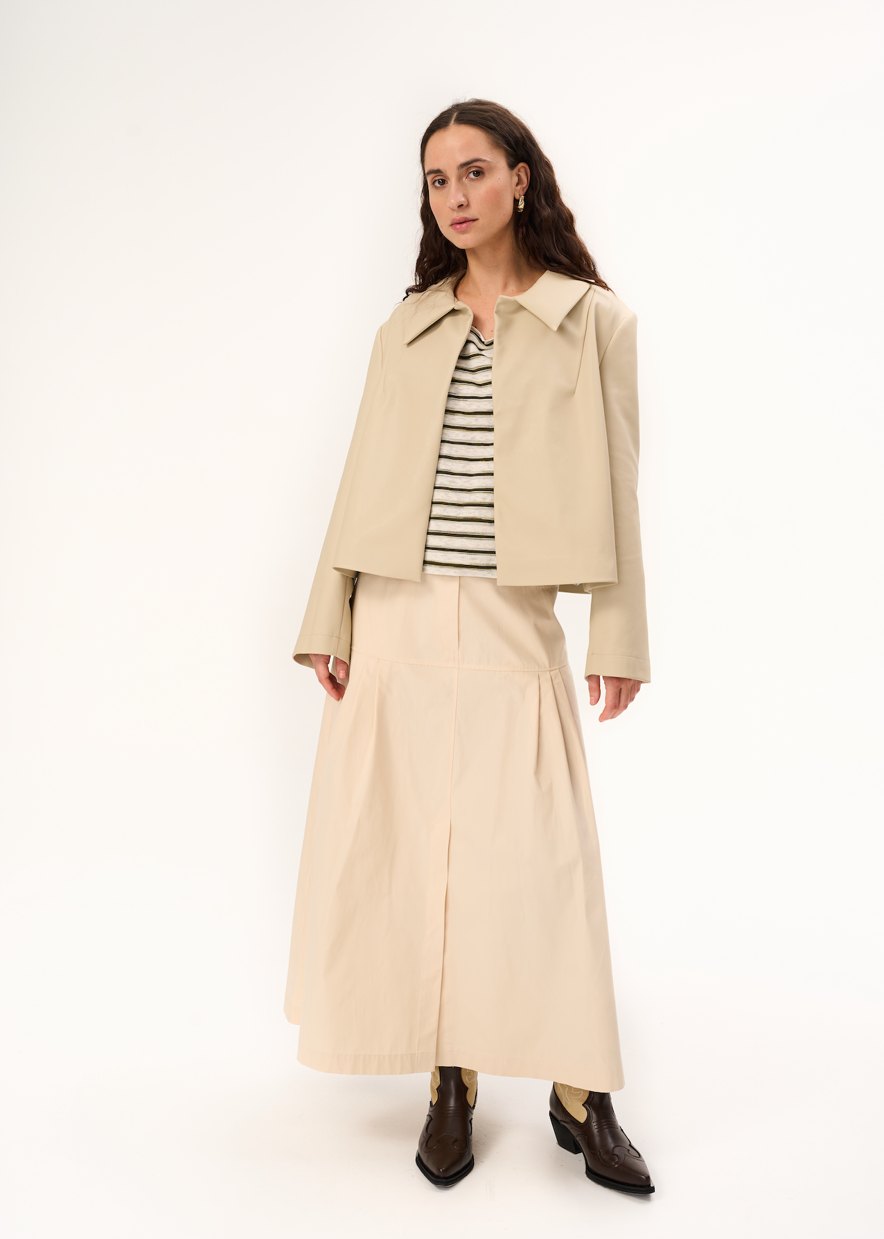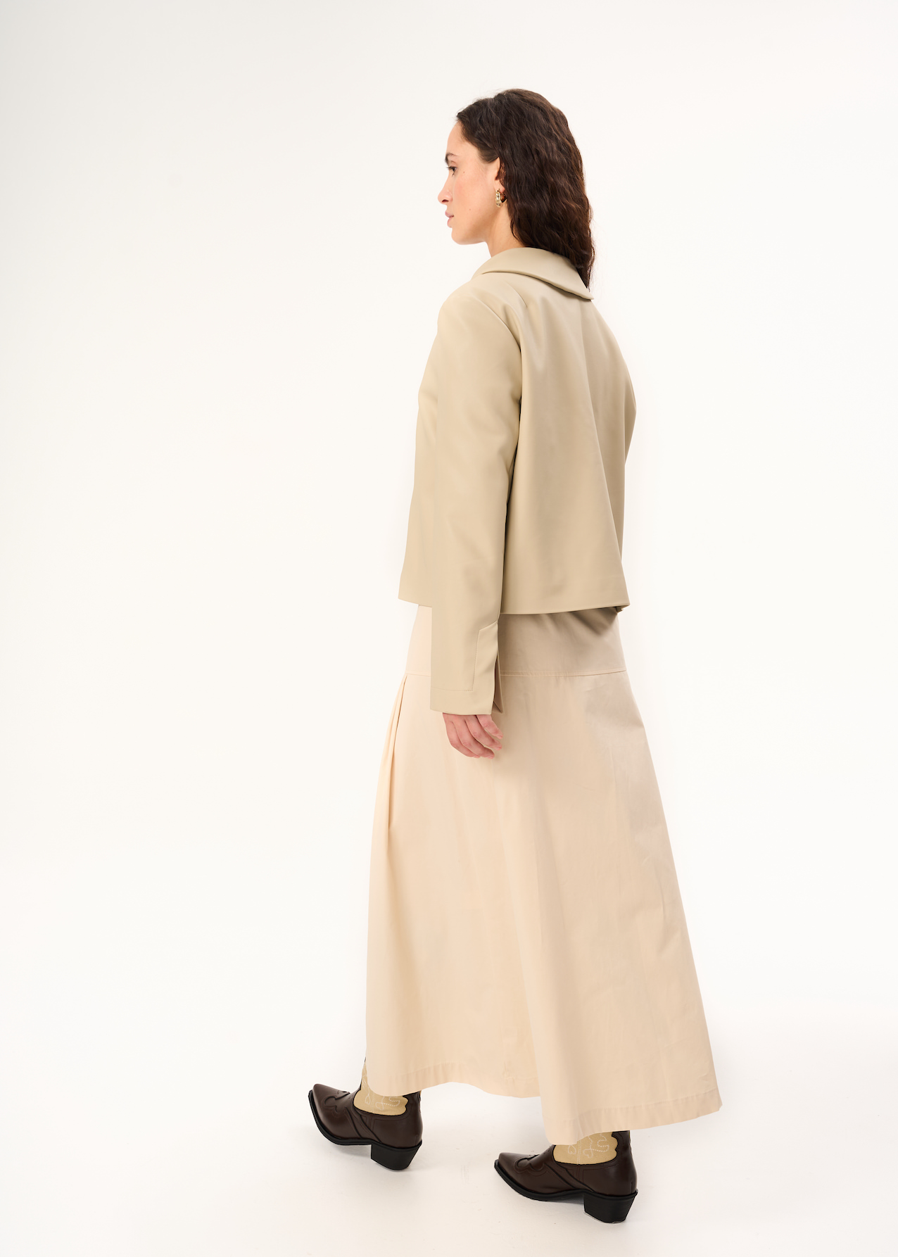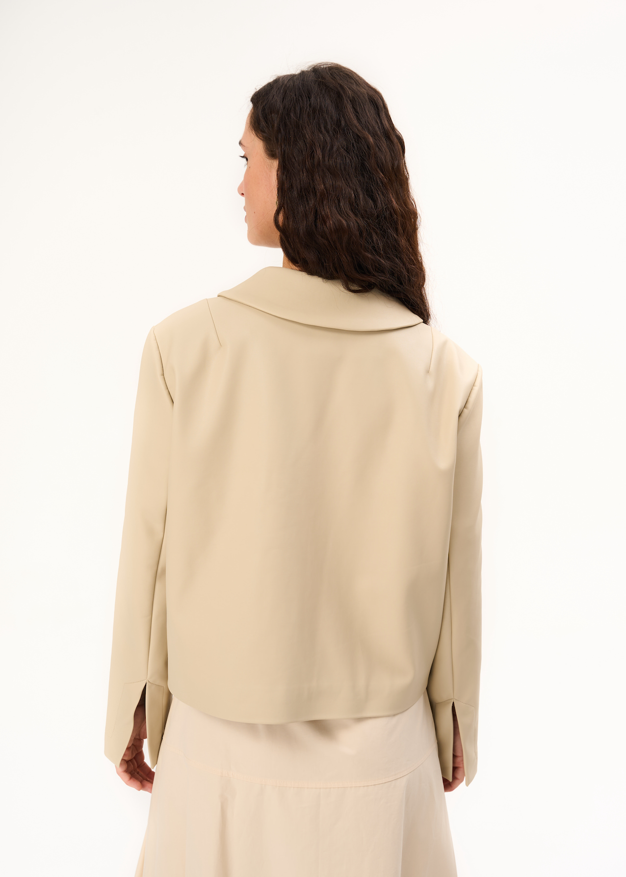 Куртка легкая из экокожи. Укороченная модель с застежкой на потайные магниты. Свободная модель с отложным воротником и рукавами полной длины.