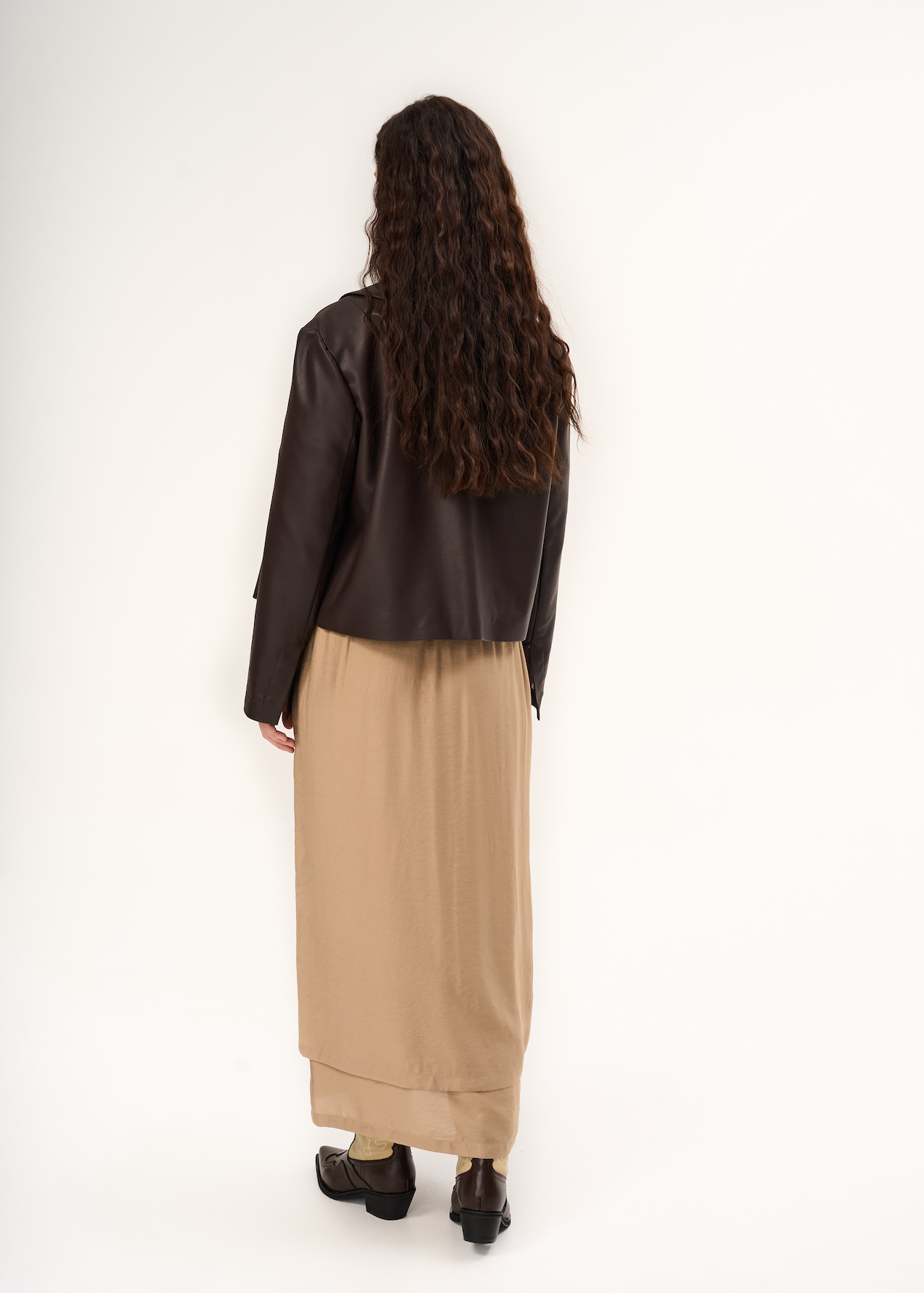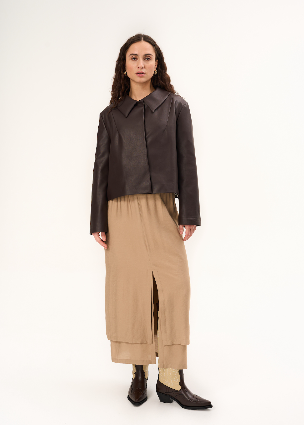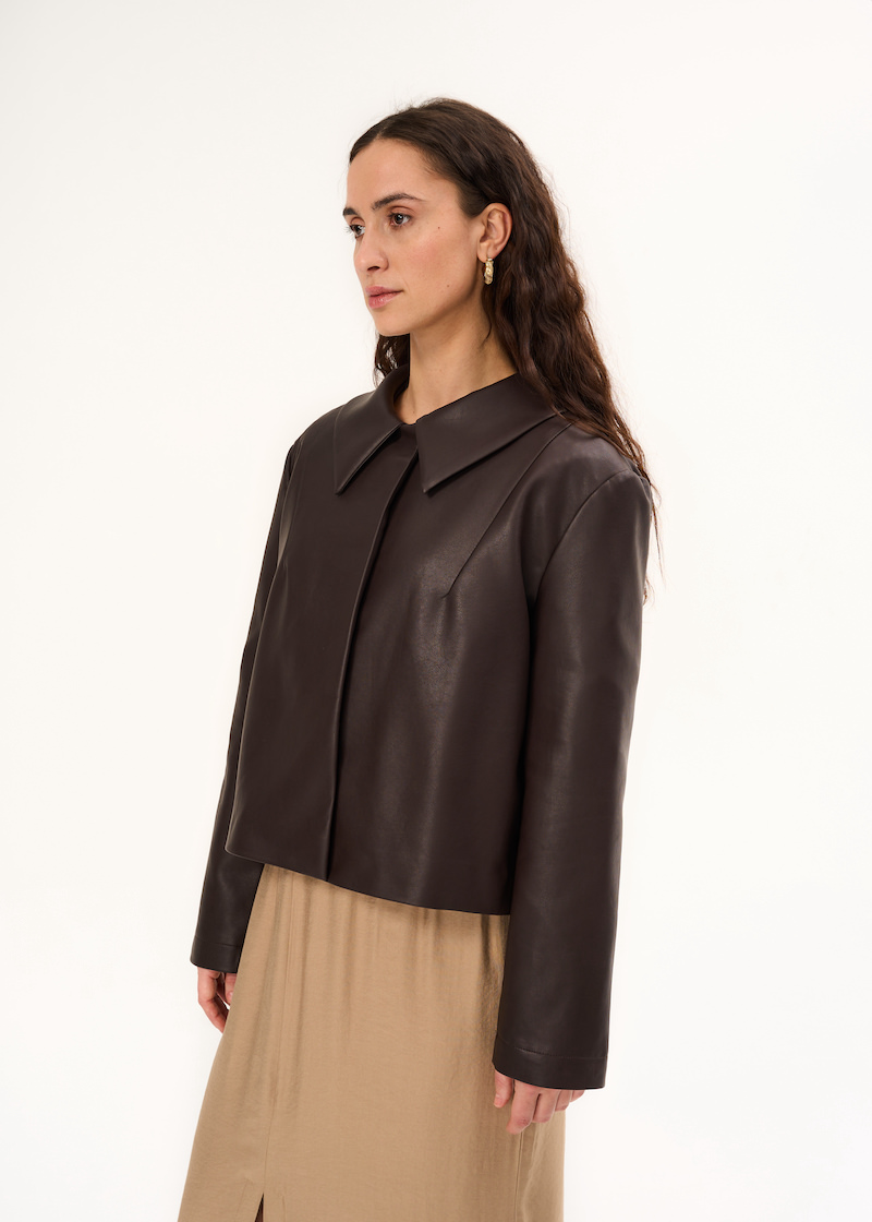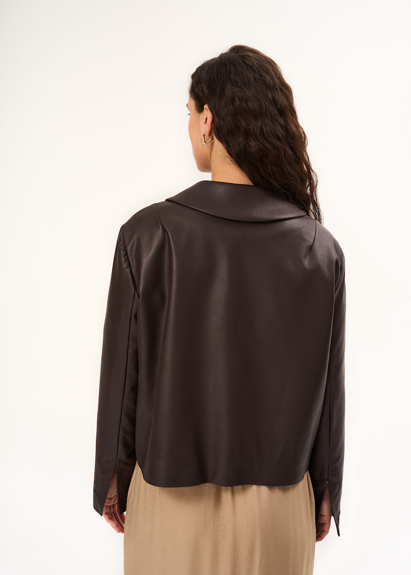 Куртка из экокожи. Укороченная модель с застежкой на потайные магниты. Свободная модель в шоколадном цвете с отложным воротником и рукавами полной длины.