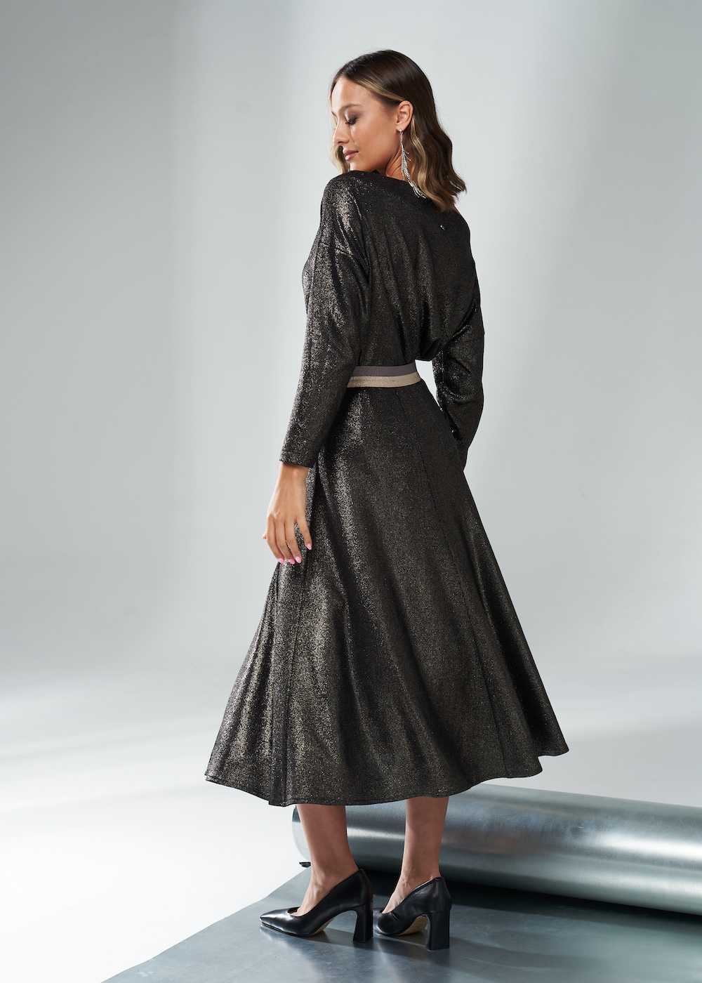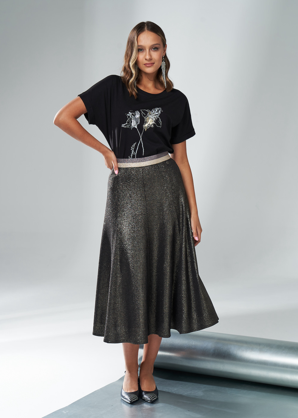 Юбка женская трикотажная тонкой вязки, черная с золотистым напылением. Расклешенный от бедра крой, длина миди. Блестящий пояс-резинка с двумя широкими полосками разного цвета. На талии вшит медальон с фирменным знаком стрекозы.