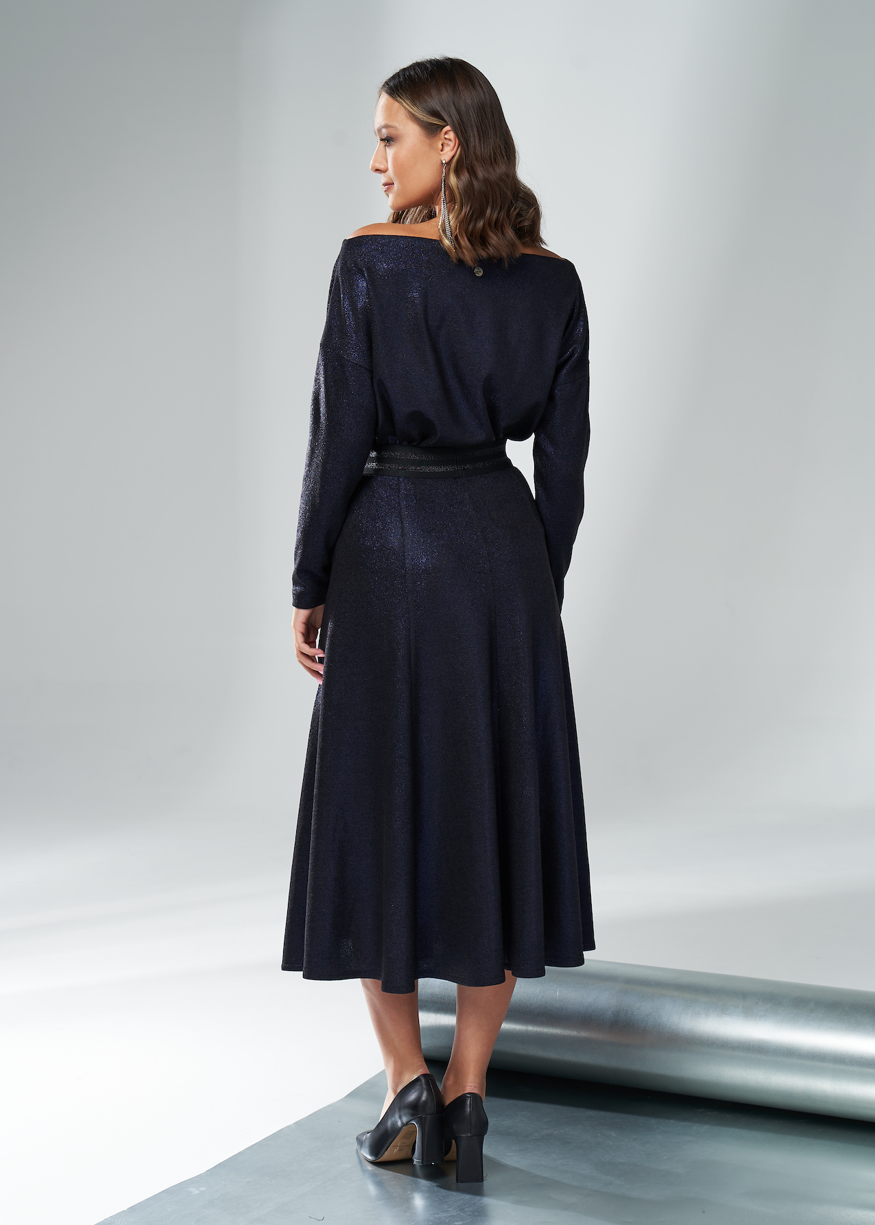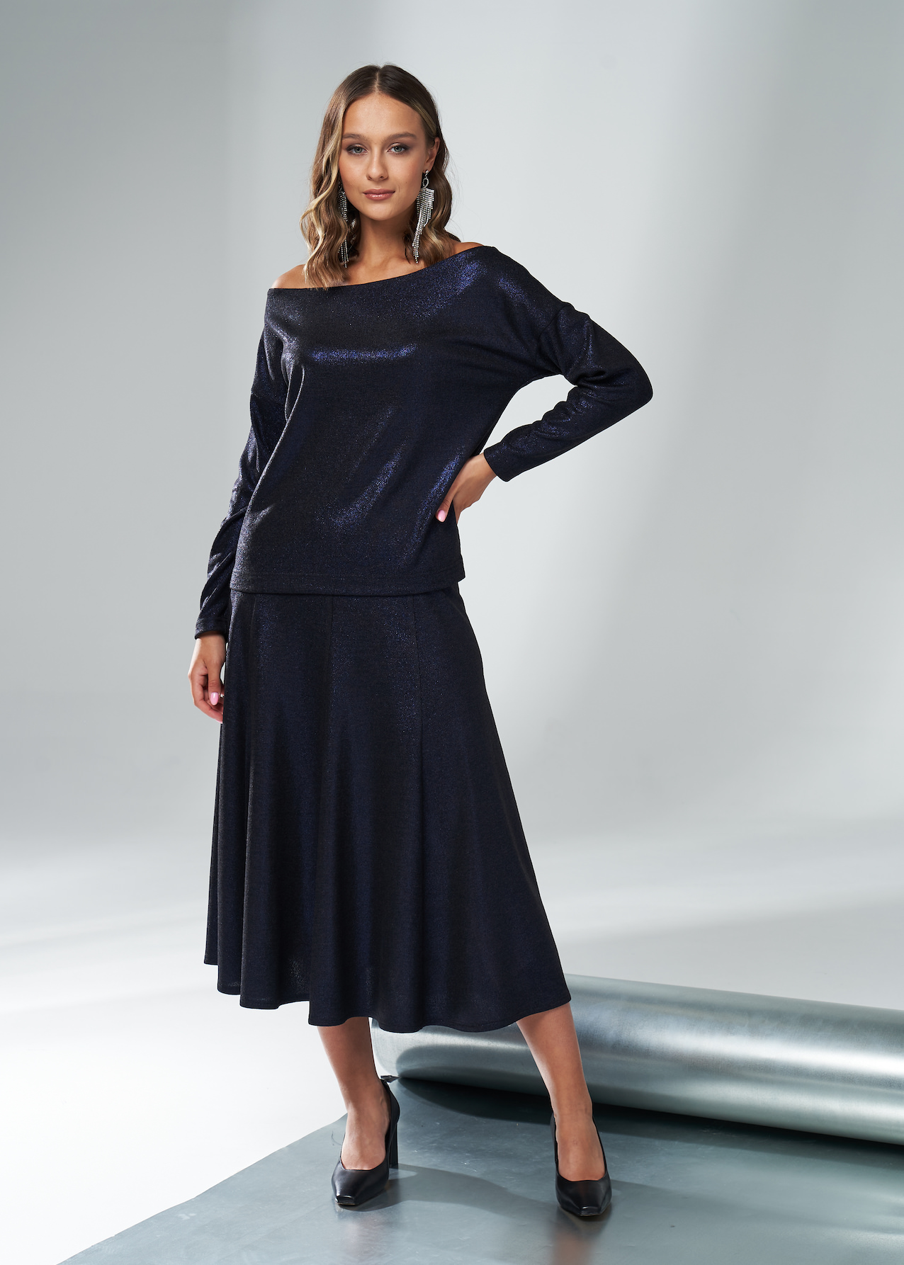 Женская юбка из трикотажа тонкой вязки, черная с блестящим фиолетовым напылением. Расклешенный от бедра крой, длина миди. Черный пояс-резинка с блестящими полосками. На талии вшит медальон с фирменным знаком стрекозы.