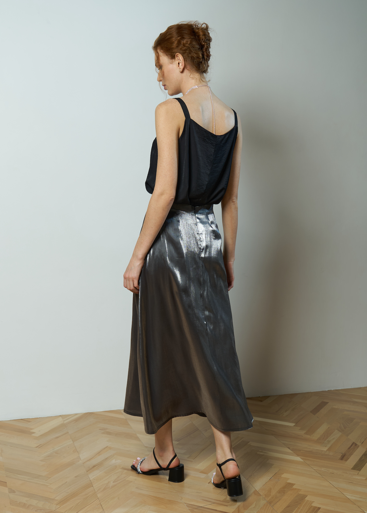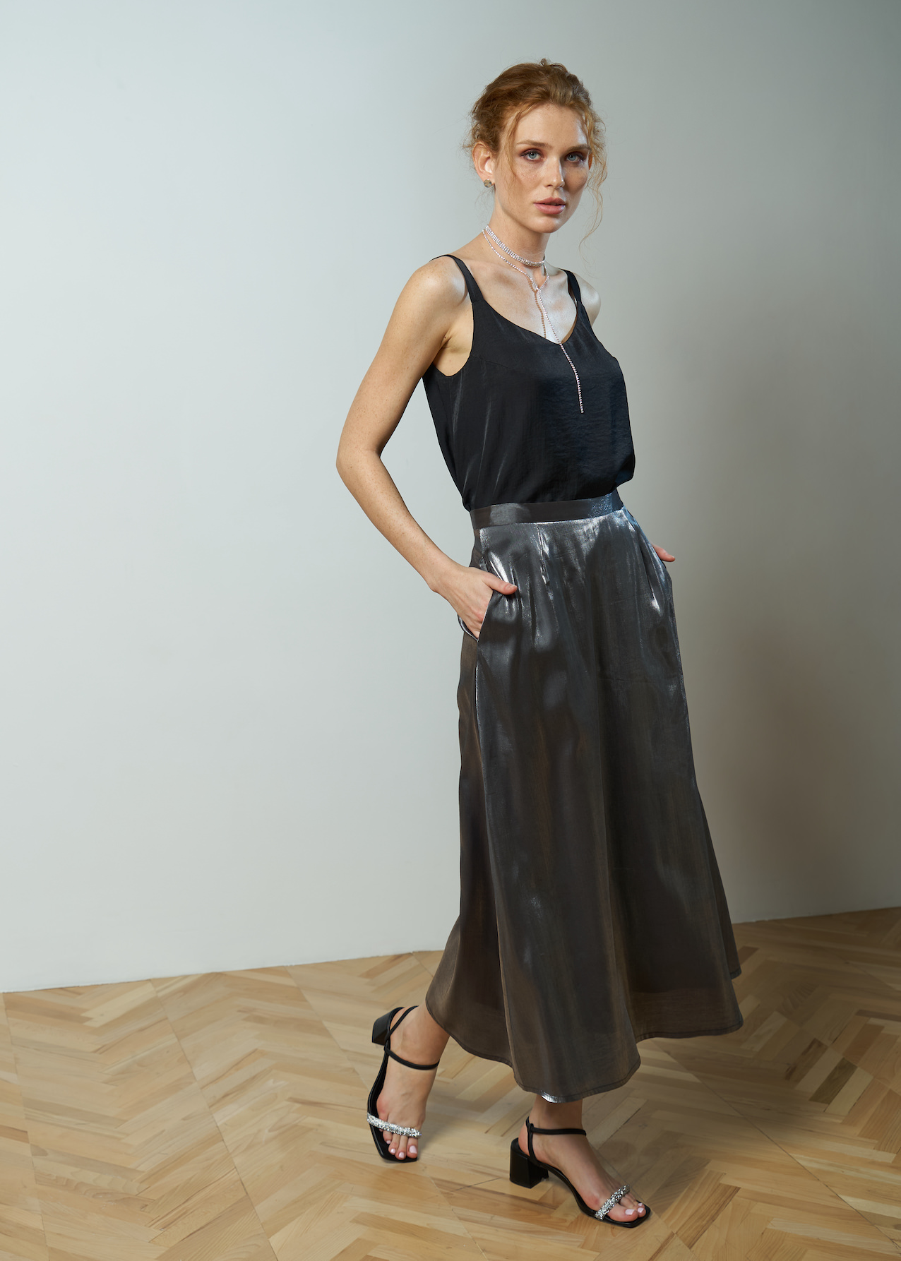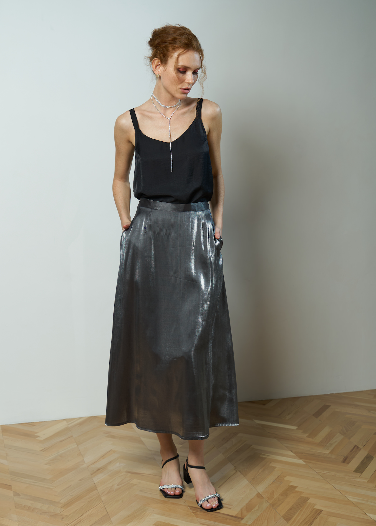 Юбка серебро вечерняя. Модель свободная от бедра длины миди, ткань с металлическим блеском. Застежка сзади на потайную молнию, по бокам карманы.