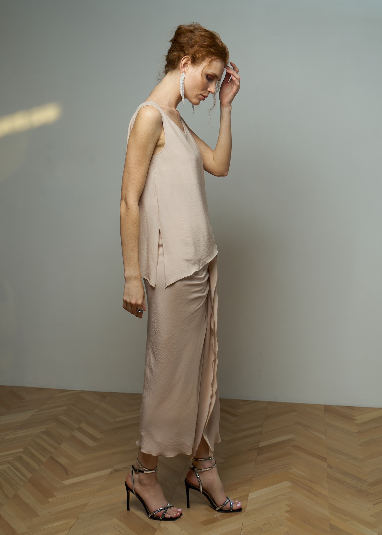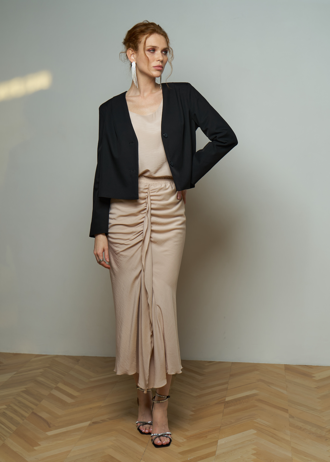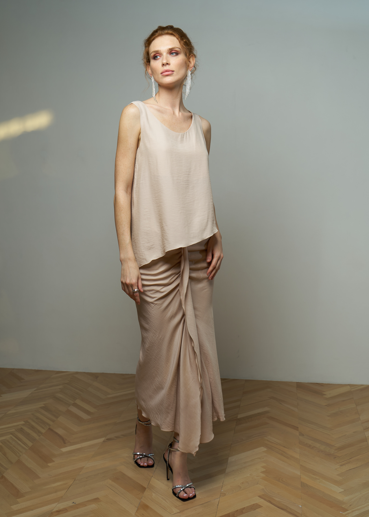 Юбка рыбка с драпировкой в районе бедер. Однотонная модель по фигуре длины миди и ассиметричным низом. Разрез в оригинальном исполнении со струящимися воланами, который можно носить спереди, сбоку или сзади. Пояс на резинке.