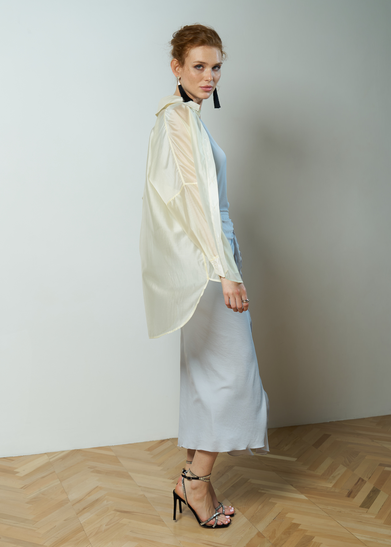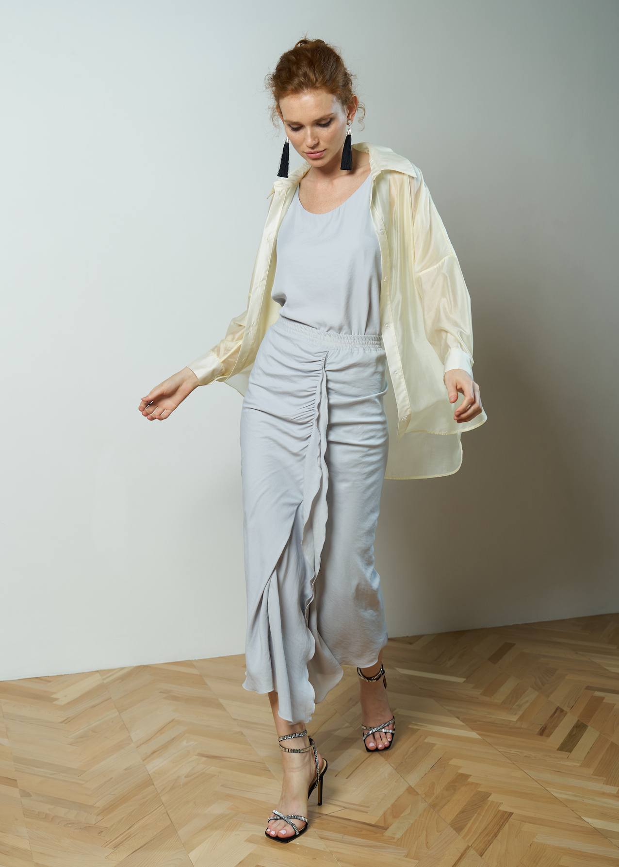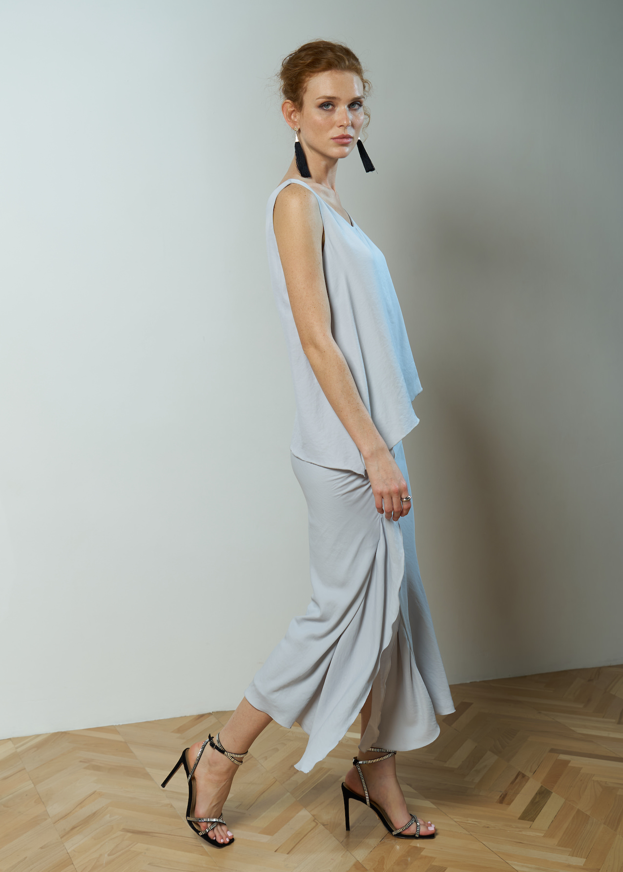 Юбка серая с драпировкой в районе бедер. Однотонная модель по фигуре длины миди и ассиметричным низом. Разрез в оригинальном исполнении со струящимися воланами, который можно носить спереди, сбоку или сзади. Пояс на резинке.