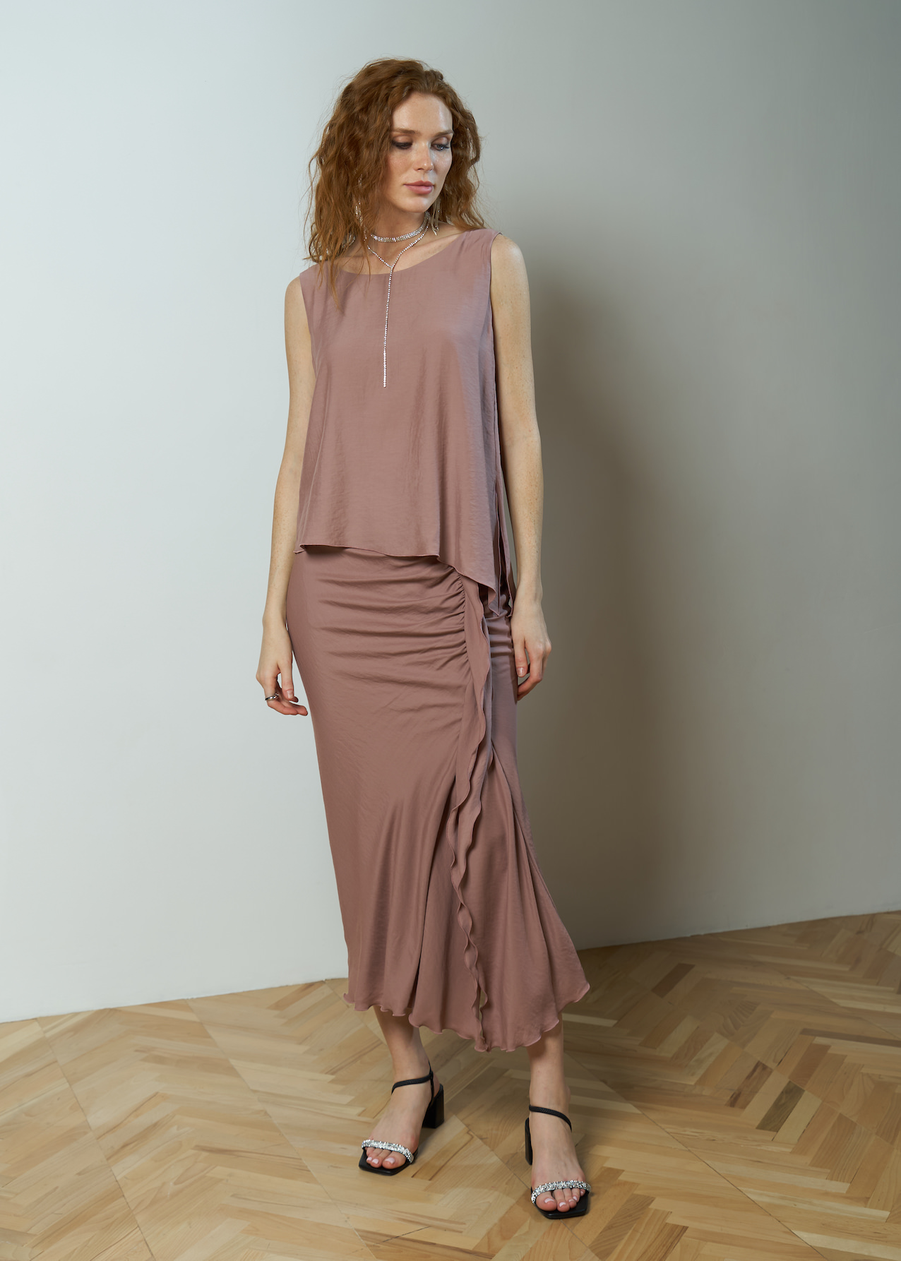 Юбка с оригинальным дизайном и драпировкой в районе бедер. Однотонная модель по фигуре длины миди и ассиметричным низом. Разрез в оригинальном исполнении со струящимися воланами, который можно носить спереди, сбоку или сзади. Пояс на резинке.