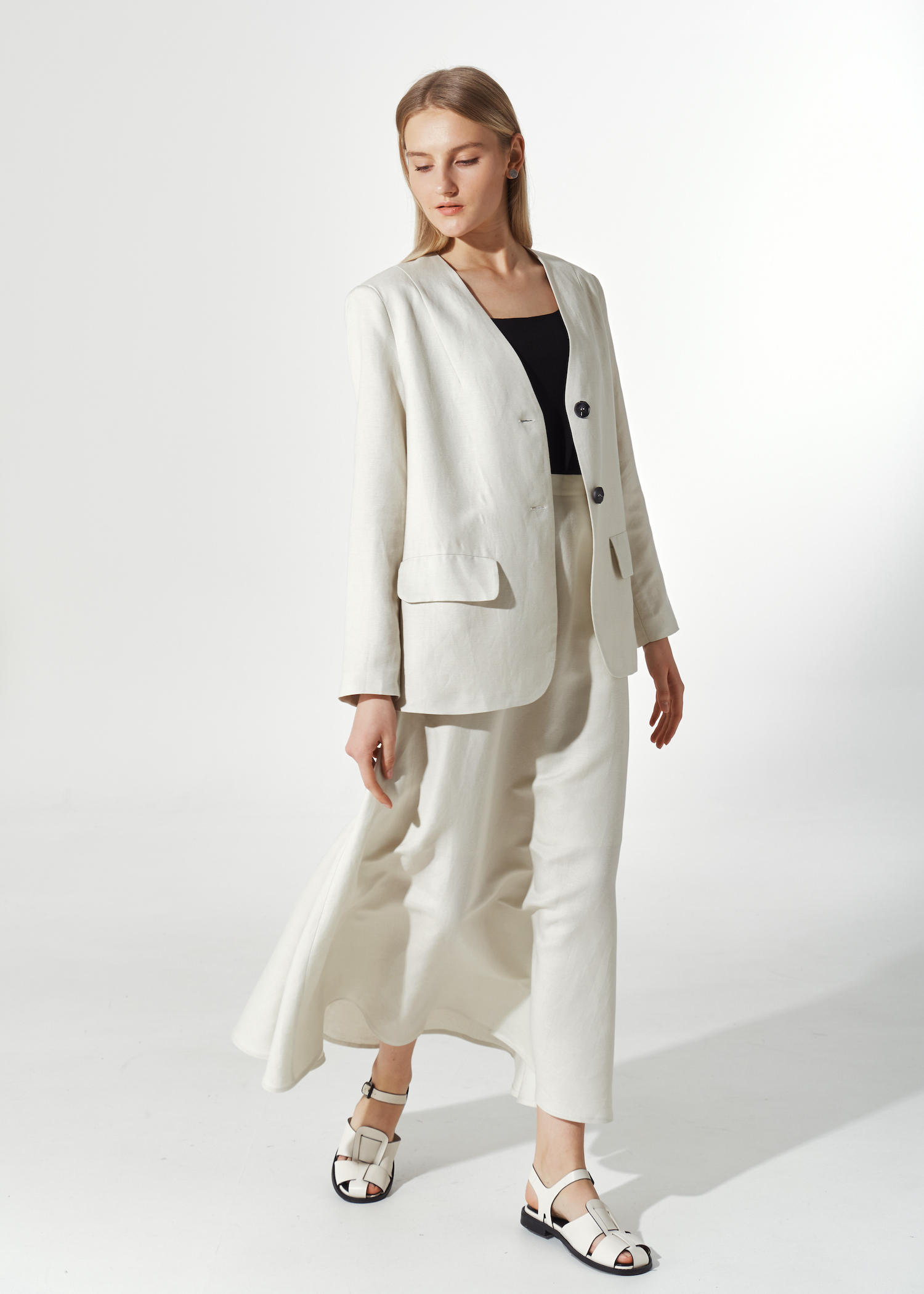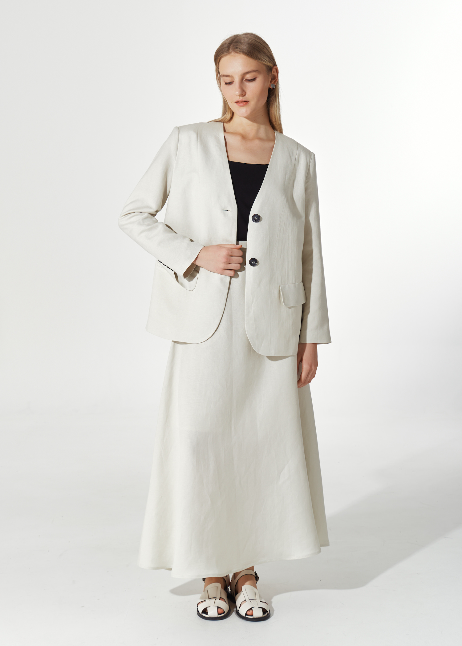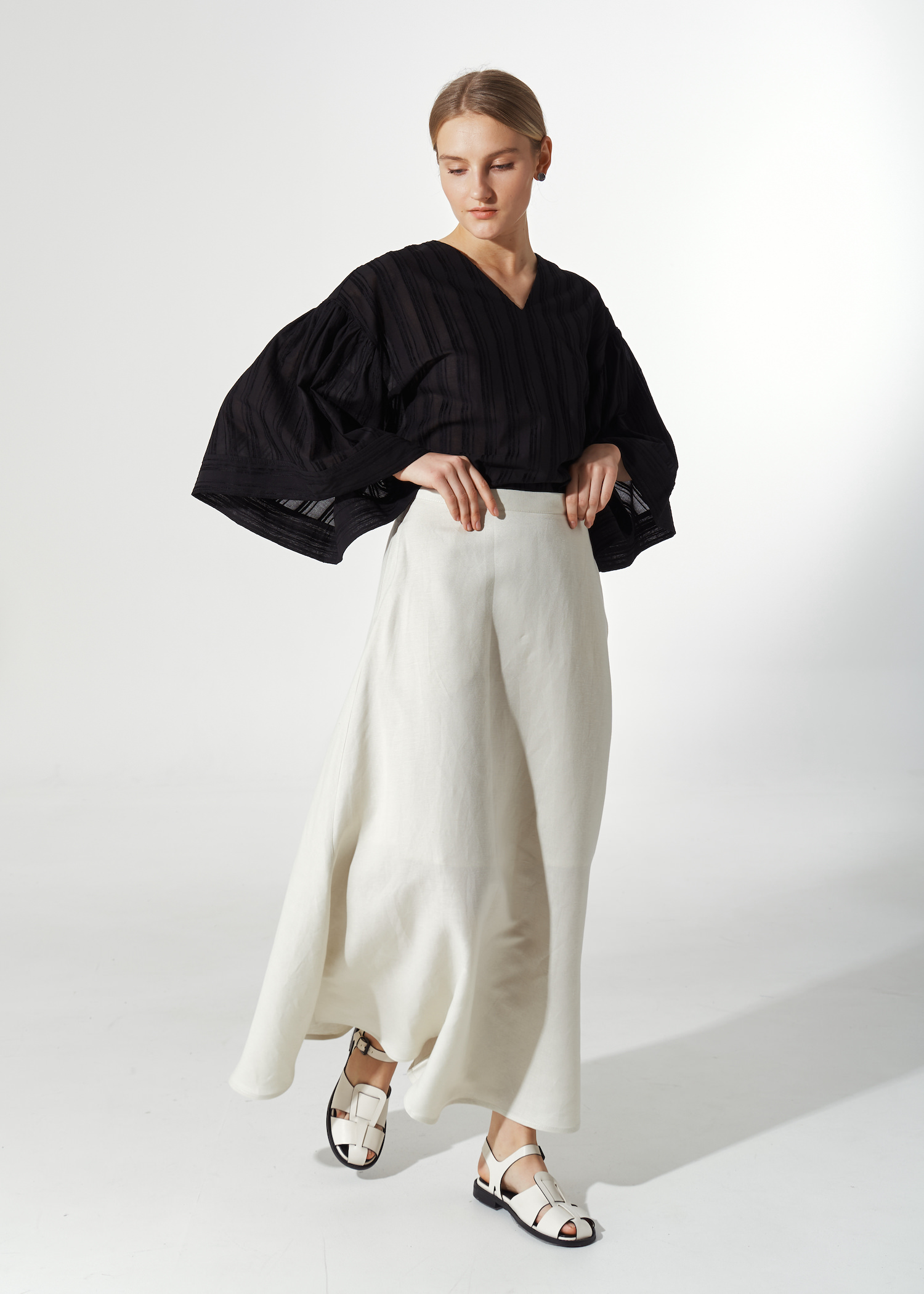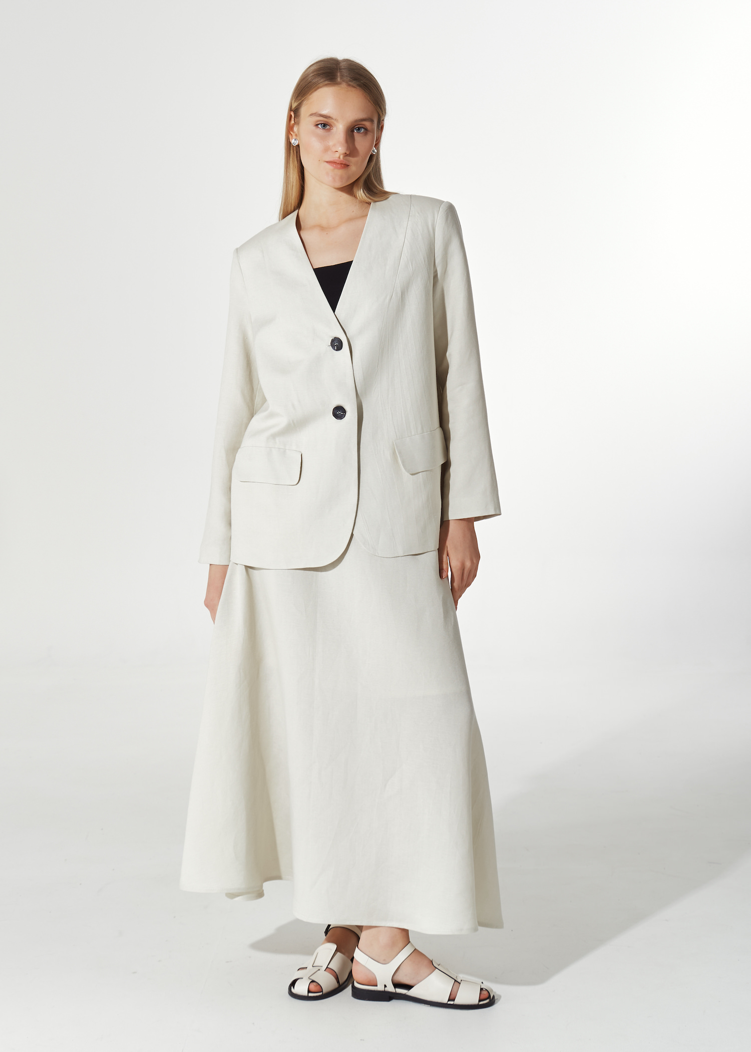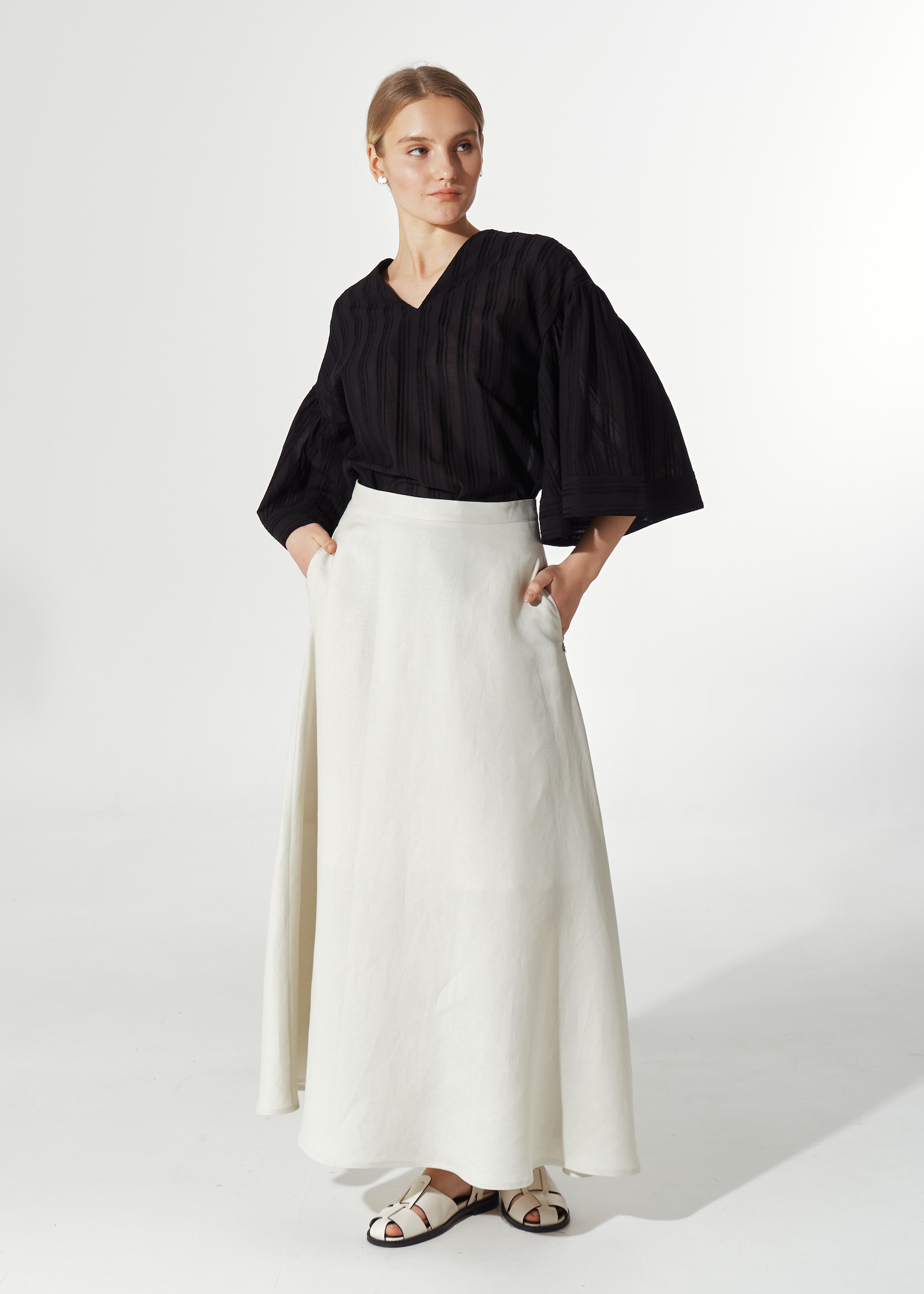 Юбка белая трапеция миди. Модель с подкладом до колена. Пояс из аналогичной ткани с застежкой на потайную молнию. По бокам просторные карманы.