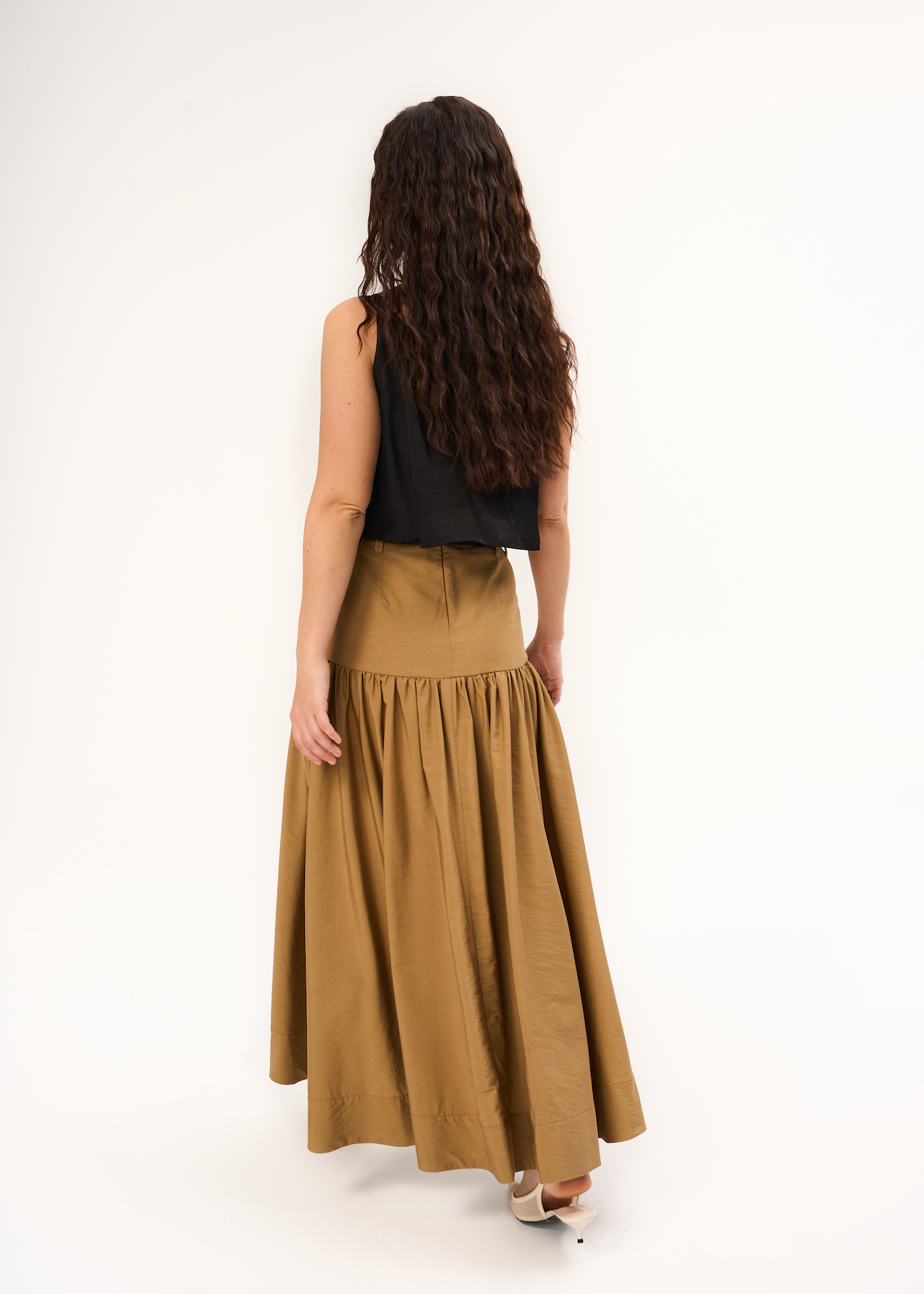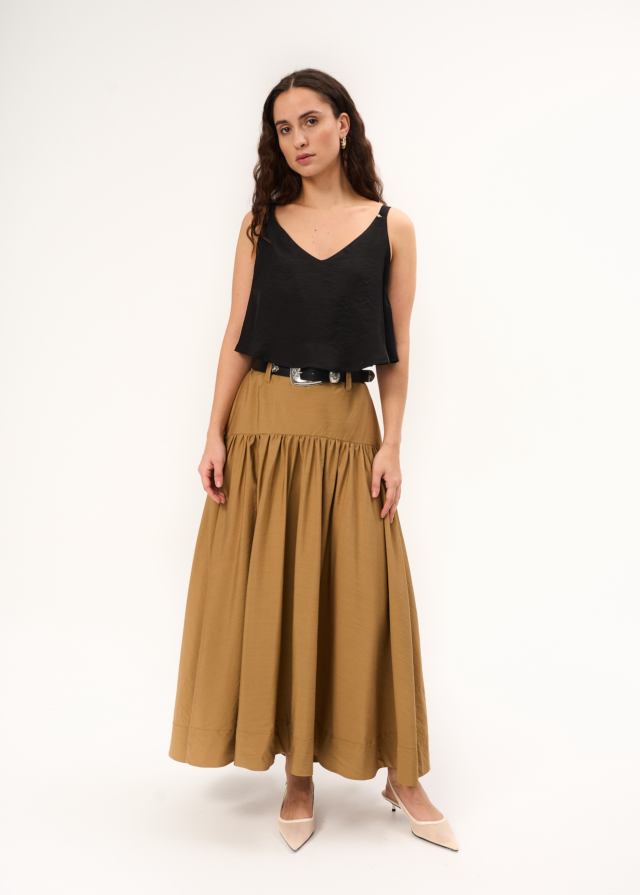 Юбка легкая макси. Воздушная модель с кокеткой и шлевками под пояс. Застежка на потайную молнию. Без пояса.