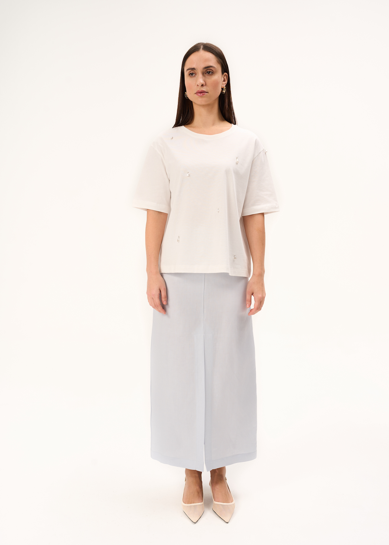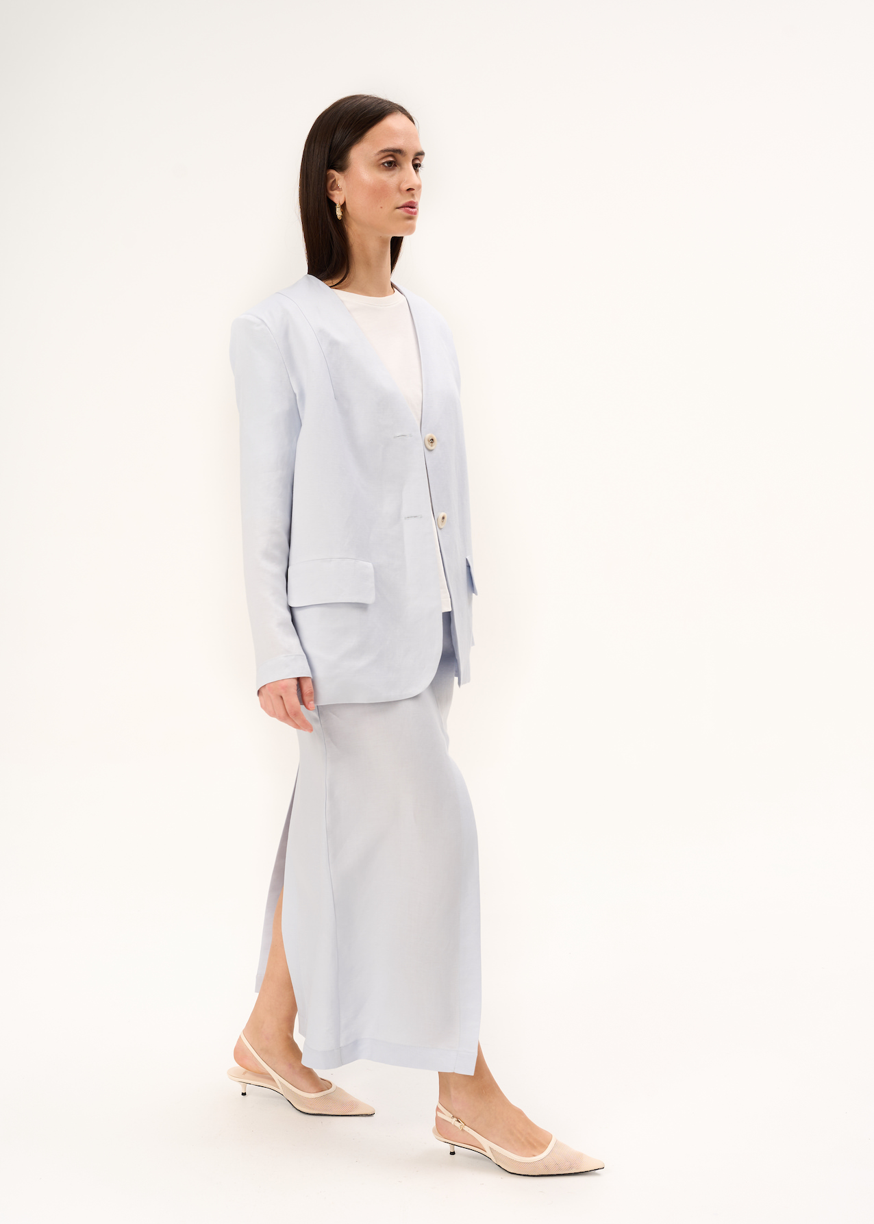 Льняная юбка макси. Модель прямого кроя с разрезом спереди. Юбка в голубом цвете на потайной молнии.