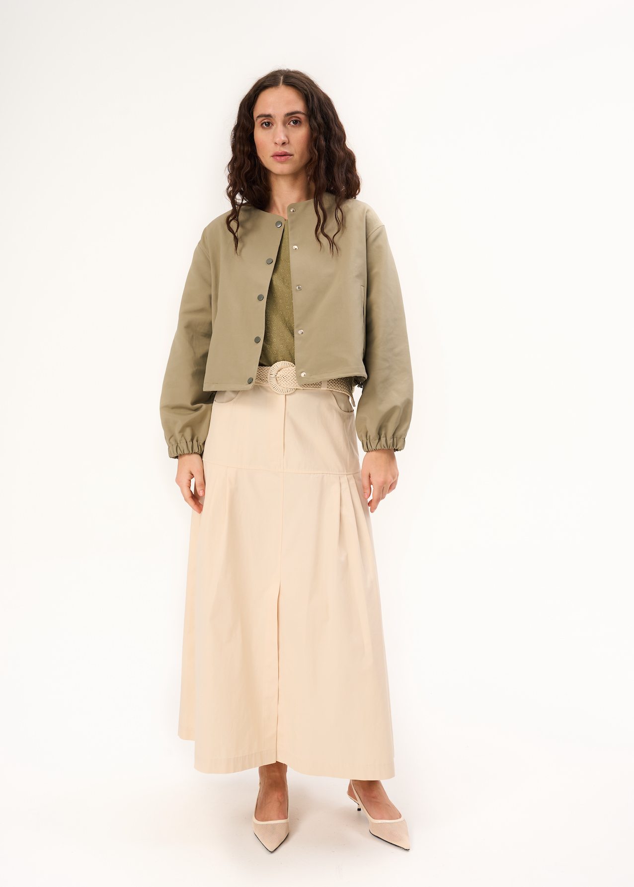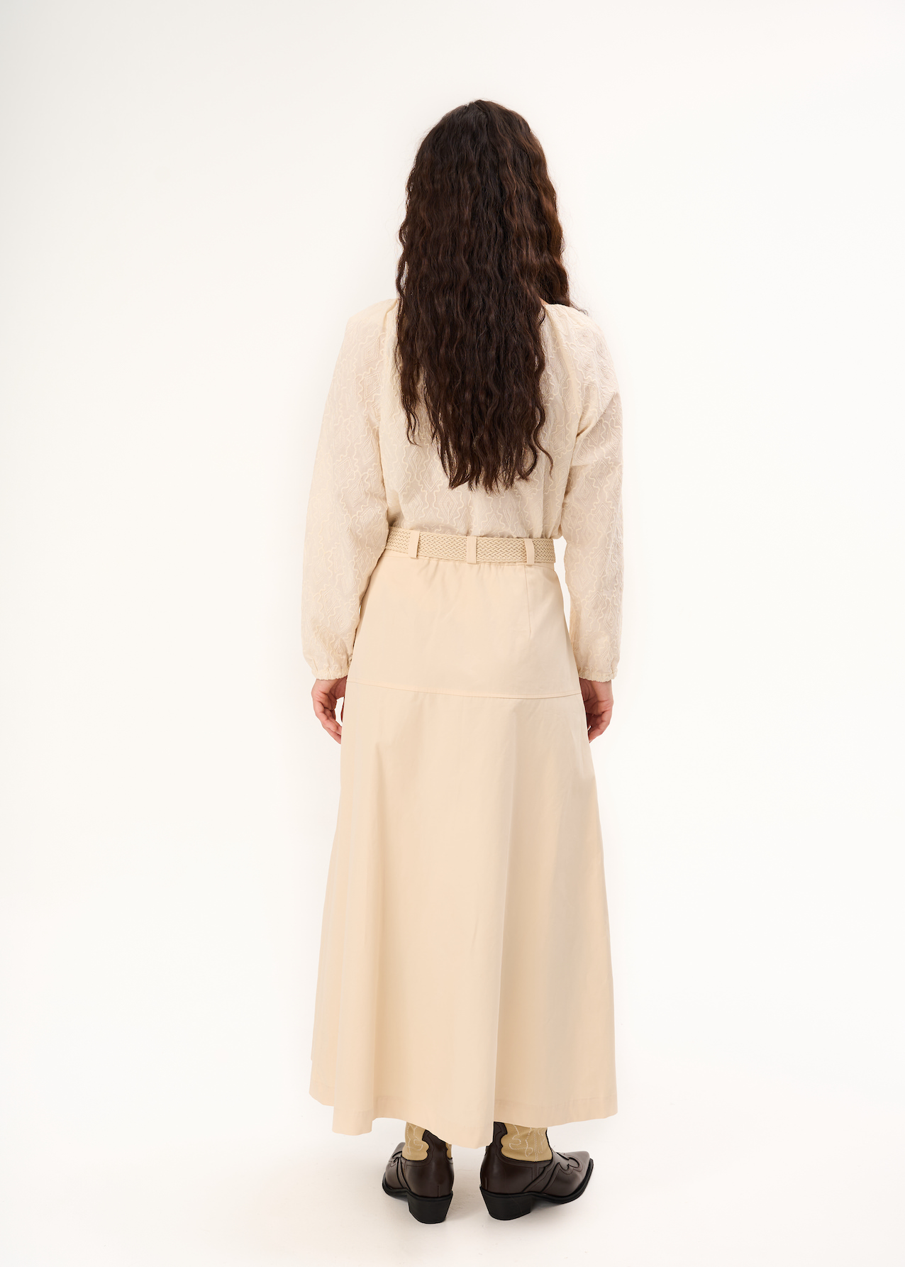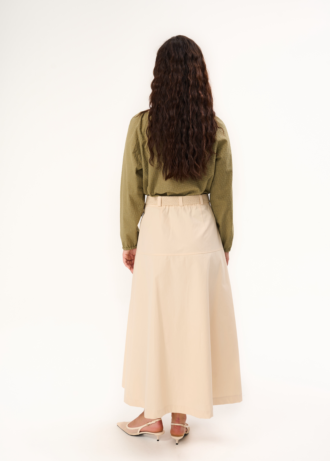 Юбка из хлопка. Модель миди с кокеткой, юбка А-силуэта с разрезом спереди изделия. Застежка на пуговку и молнию, пояс с шлевками под ремень.