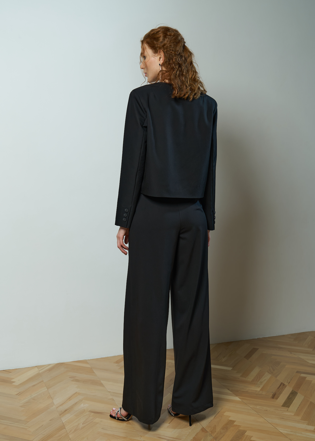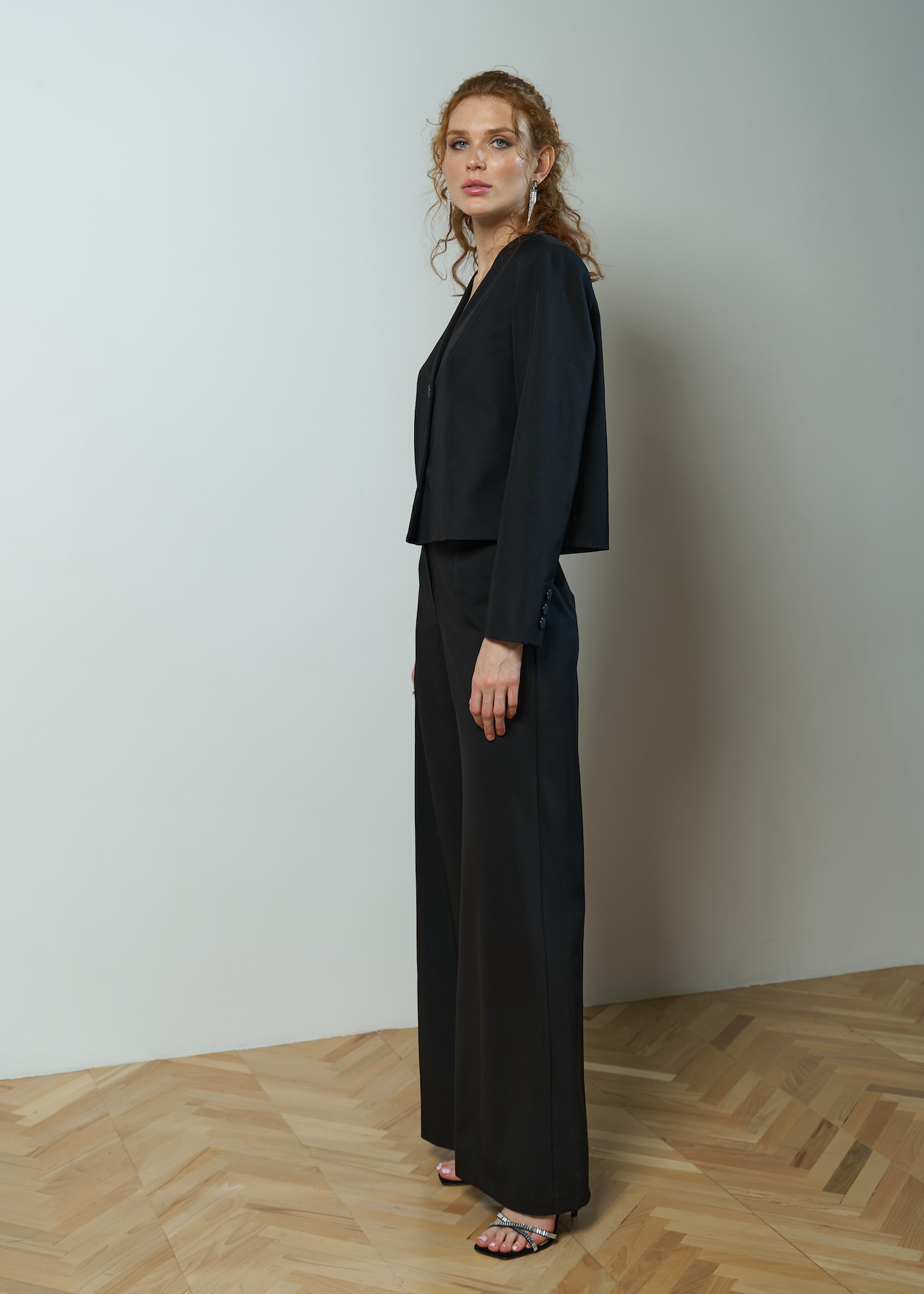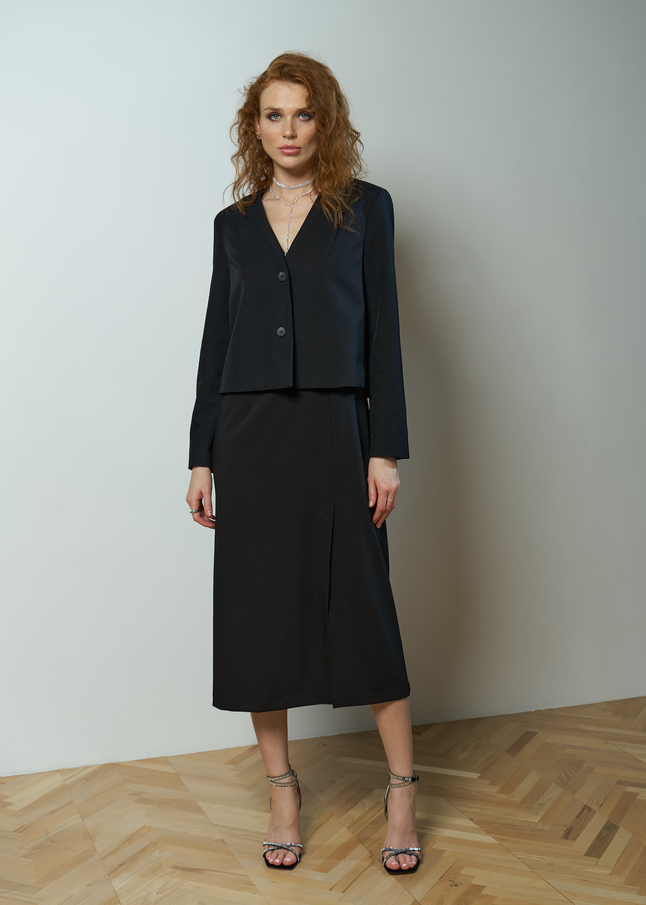 Жакет черный укороченный прямого кроя, рукав полной длины без манжет. Модель на пуговках с V-образным вырезом без лацканов.