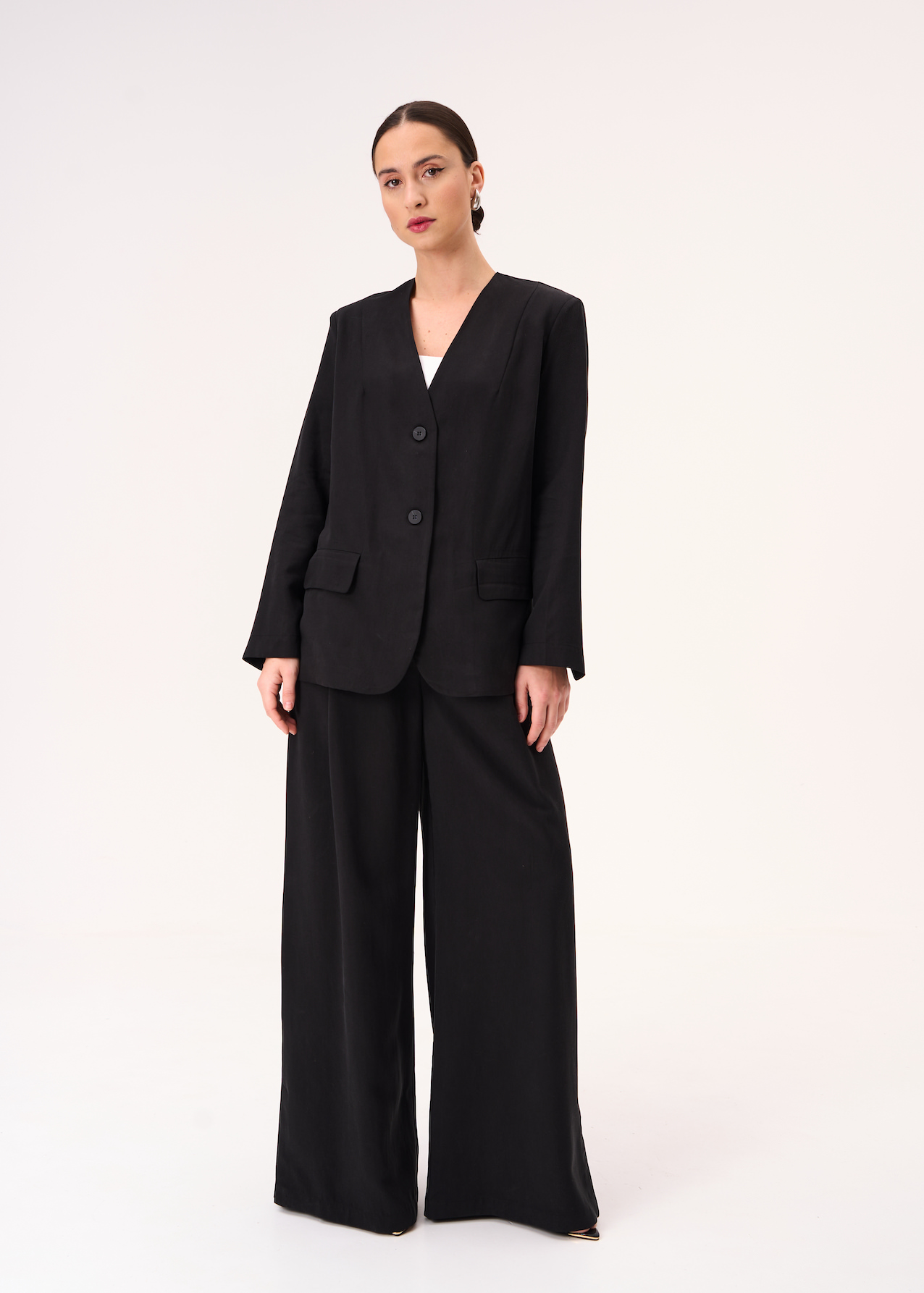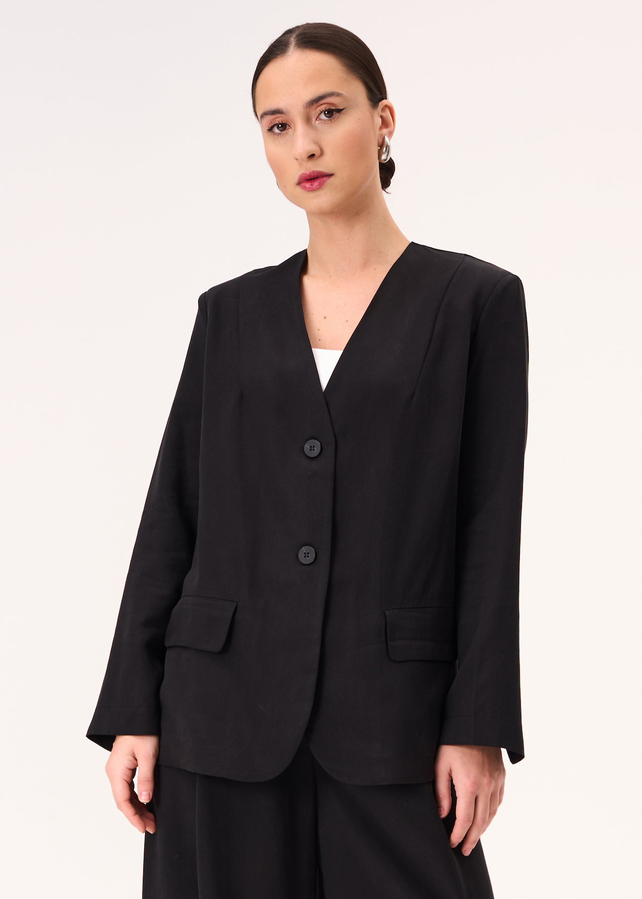Жакет черный. Модель до бедра на пуговках. Жакет с V-образным вырезом без лацканов и отложного воротника. Рукава полной длины с выраженными плечами.