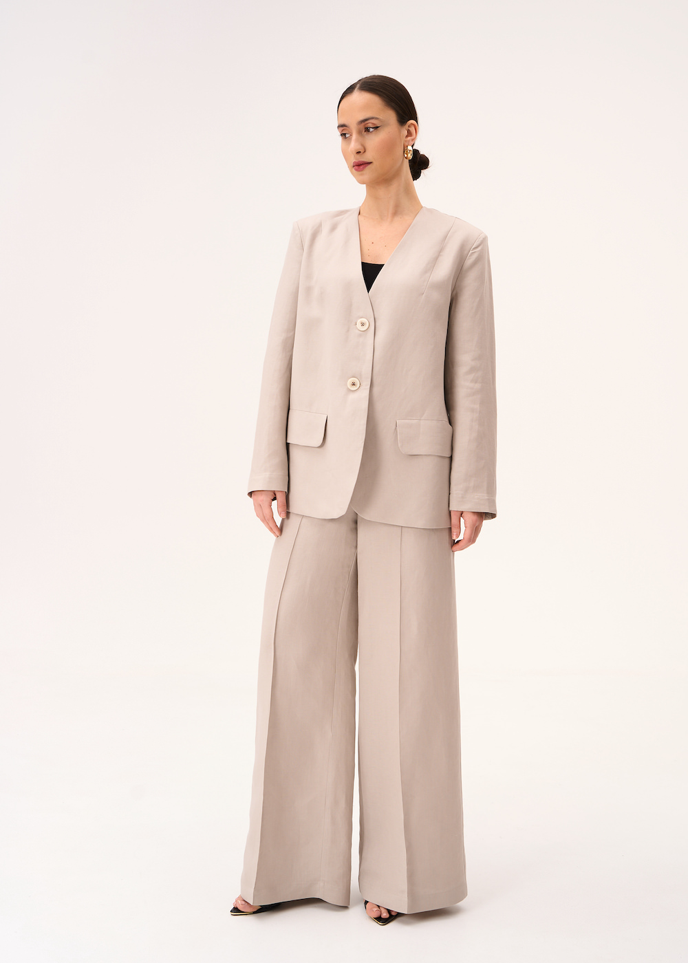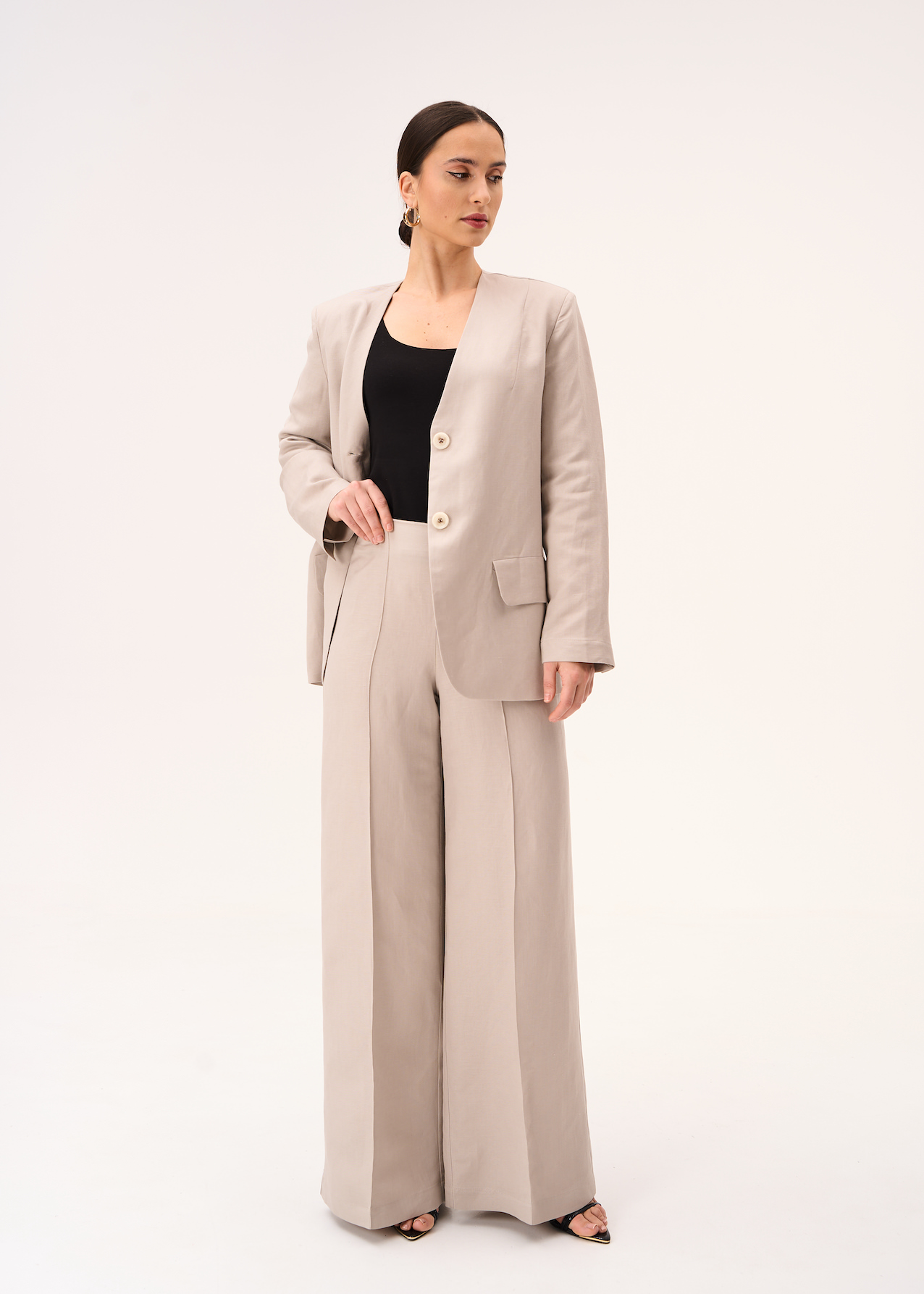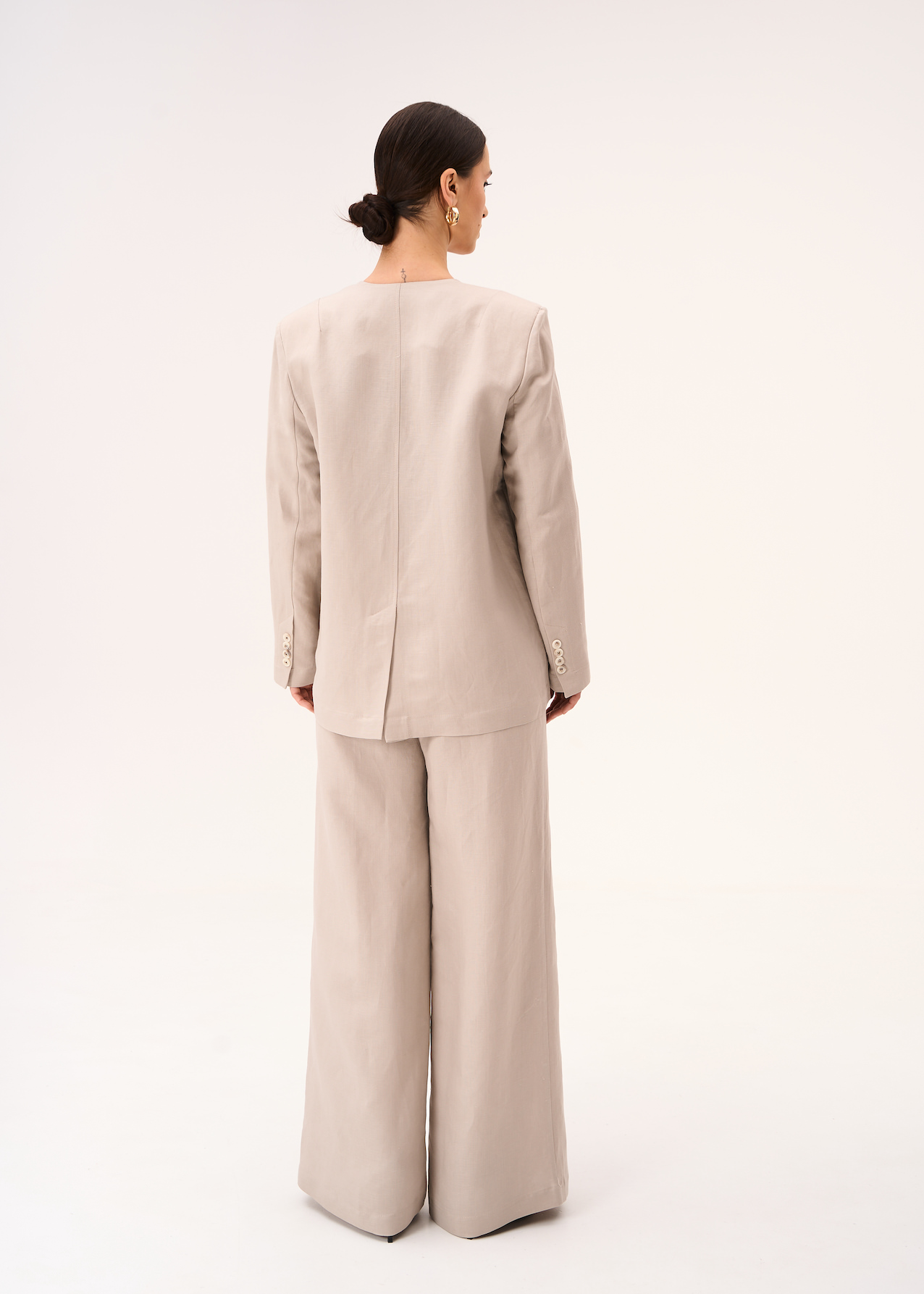 Жакет бежевый льняной. Прямая модель до бедра на пуговках. Жакет с V-образным вырезом без лацканов и отложного воротника. Рукава полной длины с выраженными плечами.